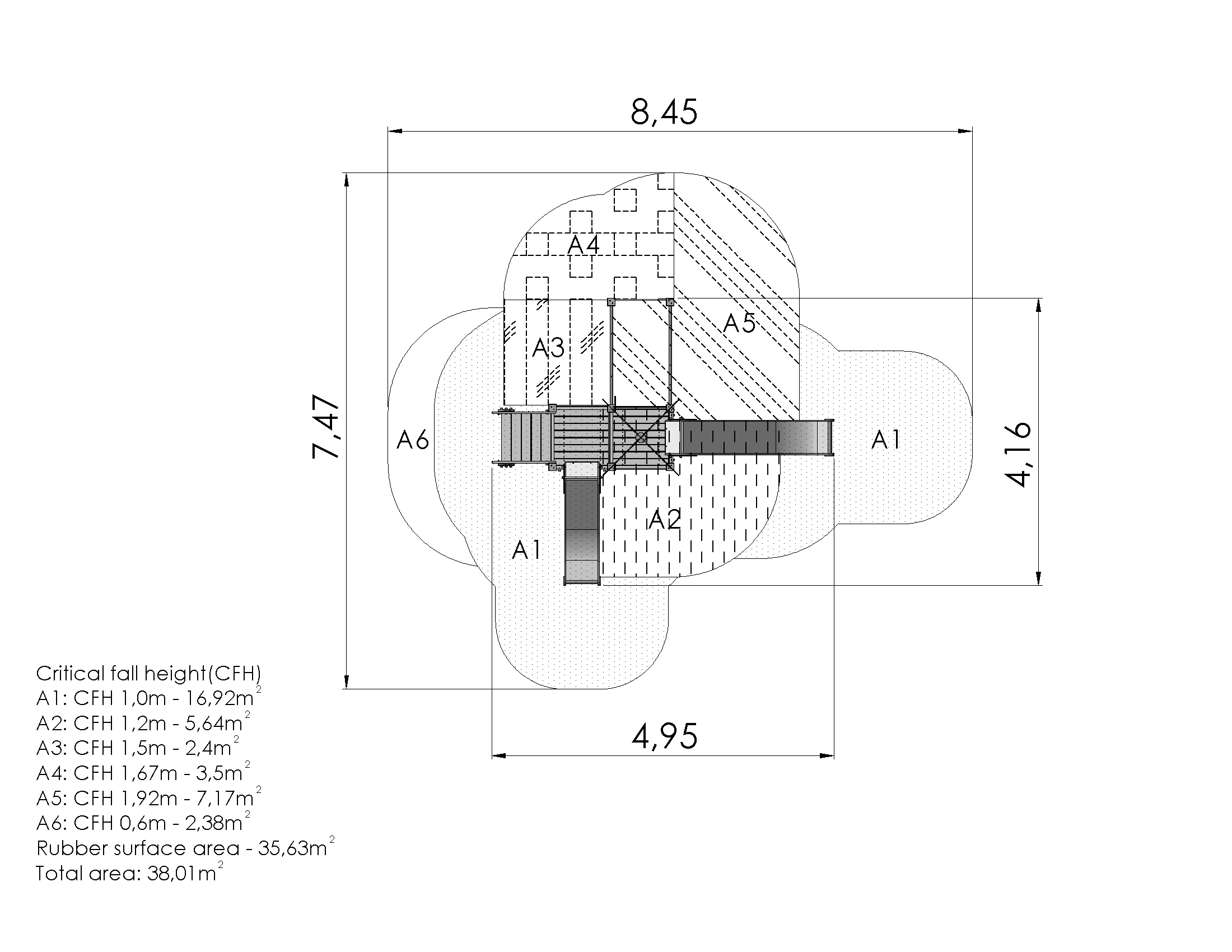 Spielplatz mit zwei Plattformen, Kletterwand und Rutsche. Die Plattformen mit verschiedenen Höhen sind über eine Treppe oder Leiter erreichbar, von beiden Plattformen führt eine Rutsche nach unten. Unter der höheren Plattform befindet sich ein Tisch für Rollenspiele. Die Seitenpaneele der Rutsche können gegen verschiedene Aktivitäts- oder thematische bedruckte Paneele ausgetauscht werden (Tiere, Vögel, Fische, Bäume, Beeren usw.), deren genaue Designs wir während des Bestellvorgangs mit dem Kunden abstimmen.