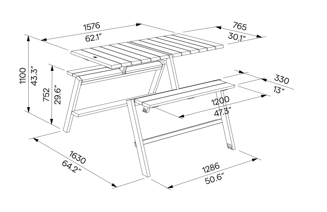 The seats and tabletop are made of solid wood boards, while the steel structure has a corrosion-protective zinc coating and a powder-coated finish.