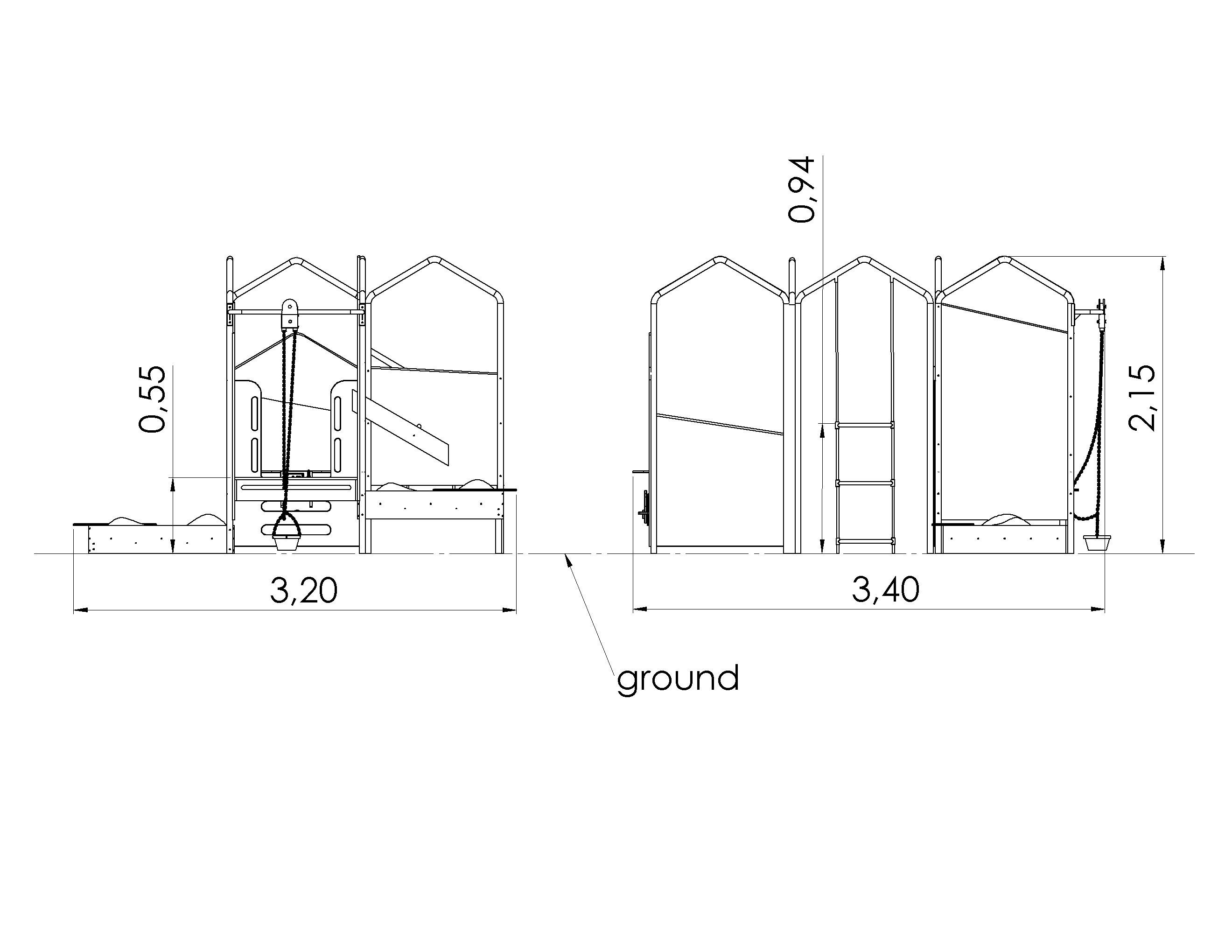 Farming complex medium is a versatile outdoor play structure, where kids can explore, engage, and learn through variety of farm-themed elements. It is a multifunctional play structure, with sand and role play elements, a climbing net, and a rope ladder. Sand play units include two sandboxes, a bucket on rail and a sand chute. The farm shop is equipped with images of different farm products, a realistic shop till and a scale to weigh. Additionally, there are printed panels with colourful descriptions of farm animals, including goats, pigs, horses, and chicken.