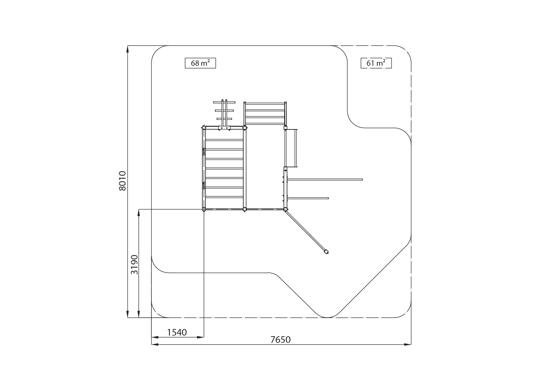 The product consists of: parallel bars, a trapeze, a push-up bar, a vertical and a horizontal ladder, chin pull and back muscle bars of different grip widths and directions. The construction of the device is made of vertical steel profiles measuring 80 x 80 mm with a wall thickness of 5 mm, and the training devices are attached to it with a bolt connection. Material: Powder-coated metal; hot-dip galvanised and powder-coated on request. The equipment is fixed to the ground by concreting, and an anchor bolt connection is available as a special solution. The set is TÜV certified according to the standard EN 16630: 2015.