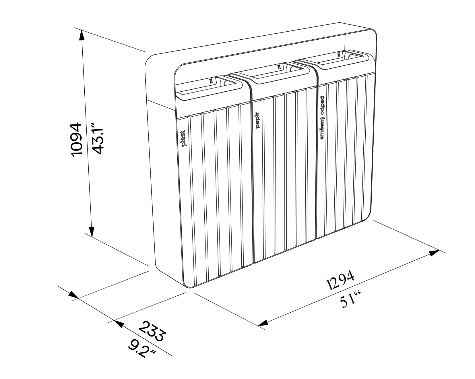 The 3-compartment litter bin has a solid roof for rain protection and contains three separate inner metal bins, which can be emptied through the lockable front door. The bin frame is made of galvanized and powder-coated steel, while the double-sided side panels are made of solid wood.