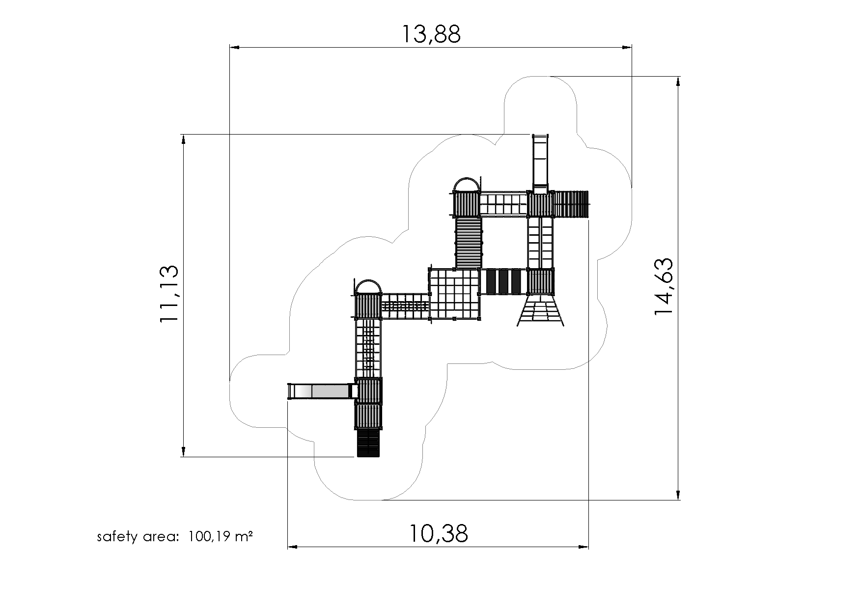 A fun and versatile multi activity centre with six platforms, a bridge with moving steps, a sloped bridge, a net tunnel, a suspension bridge with suspended walkway, an arched path, ladders and net bridges with handrails. For sliding there are two fireman’s poles and two slides. The centre is decorated with marine themed elements. The side panels of the multi activity centre can be switched for various activity walls or thematic printed panels (animals, birds, fish, trees, berries, etc.). The design of the panels will be finalised with the client during ordering.