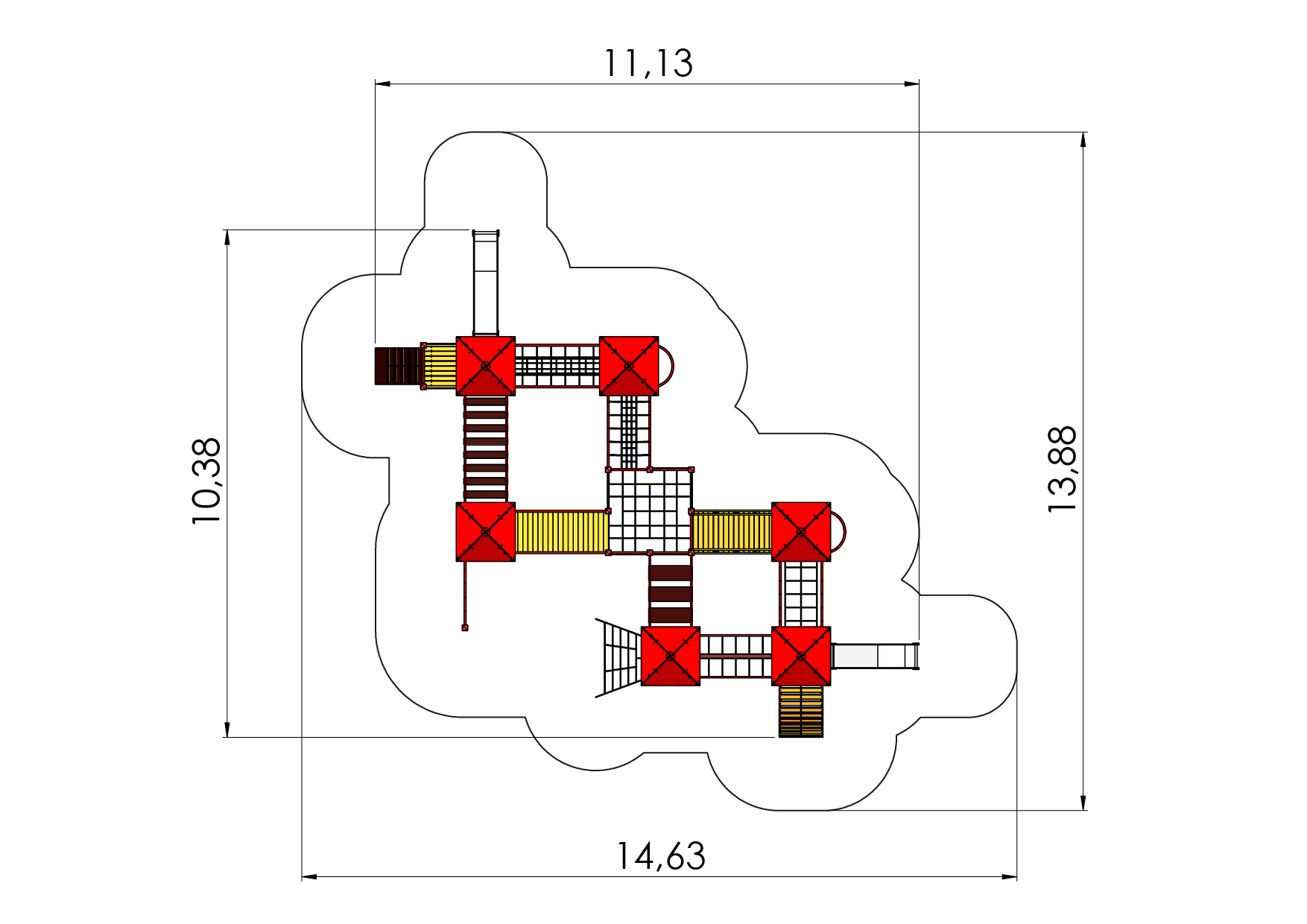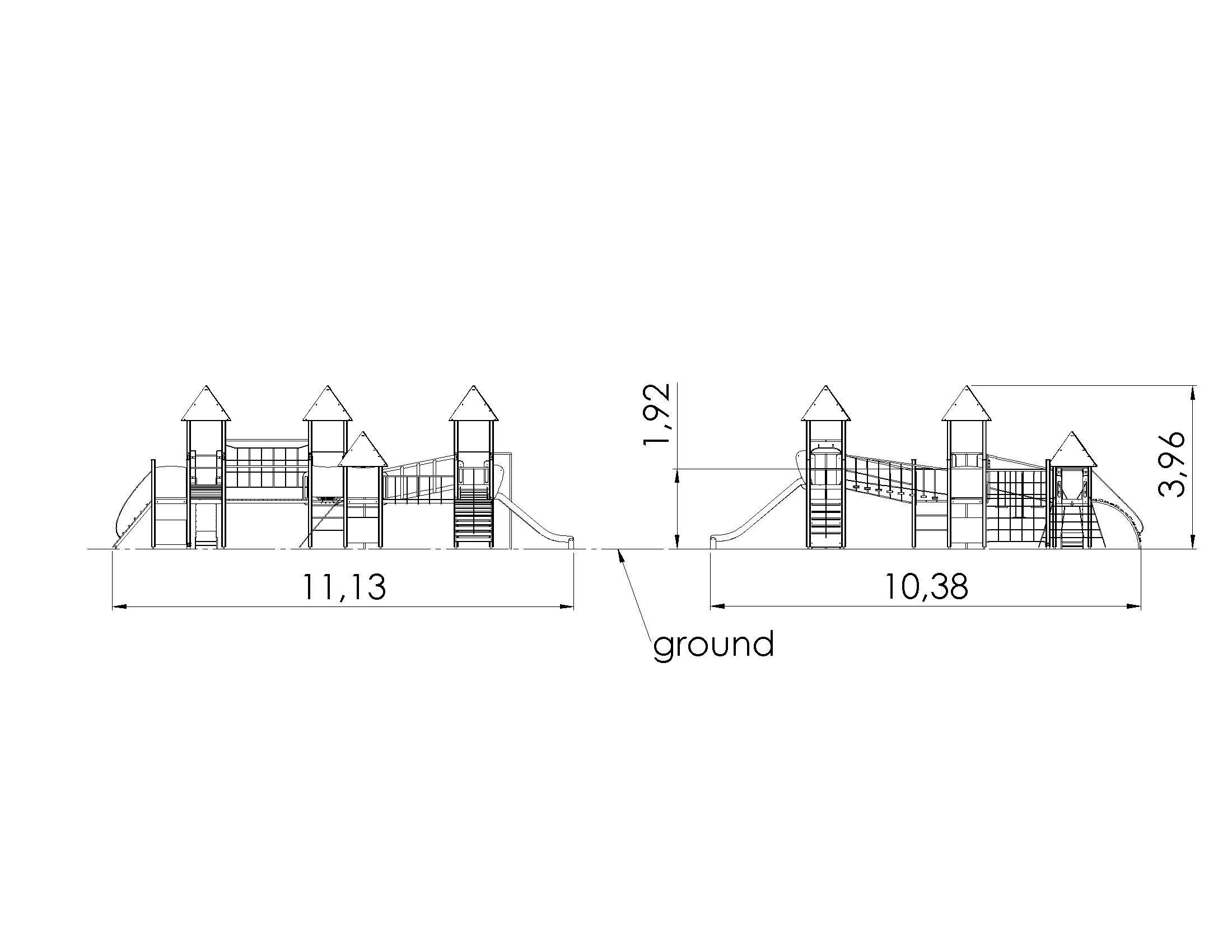 A fun and versatile multi activity centre with seven platforms (six of them with roofs), two slides and two fireman’s poles, a climbing wall, a net tunnel, a ramp with rungs, an arched path, balance bridges with suspended walkways, ladders and net bridges. The side panels of the multi activity centre can be switched for various activity walls or thematic printed panels (animals, birds, fish, trees, berries, etc.). The design of the panels will be finalised with the client during ordering.