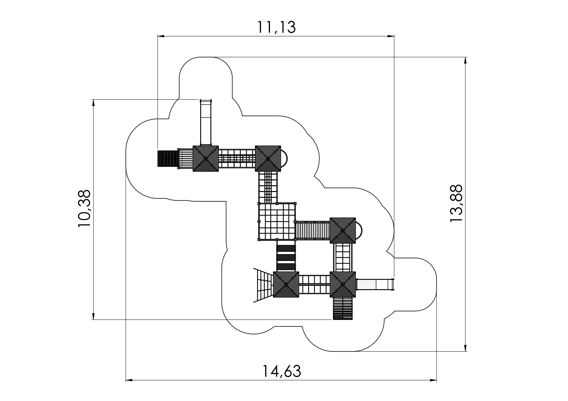 A fun and versatile multi activity centre with six platforms, a bridge with moving steps, a sloping bridge, a net tunnel, a bridge with a suspended walkway, an arched path, ladders and net bridges with handrails. Two fireman’s poles and two slides offer sliding opportunities. The side panels of the multi activity centre can be switched for various activity walls or thematic printed panels (animals, birds, fish, trees, berries, etc.). The design of the panels will be finalised with the client during ordering.