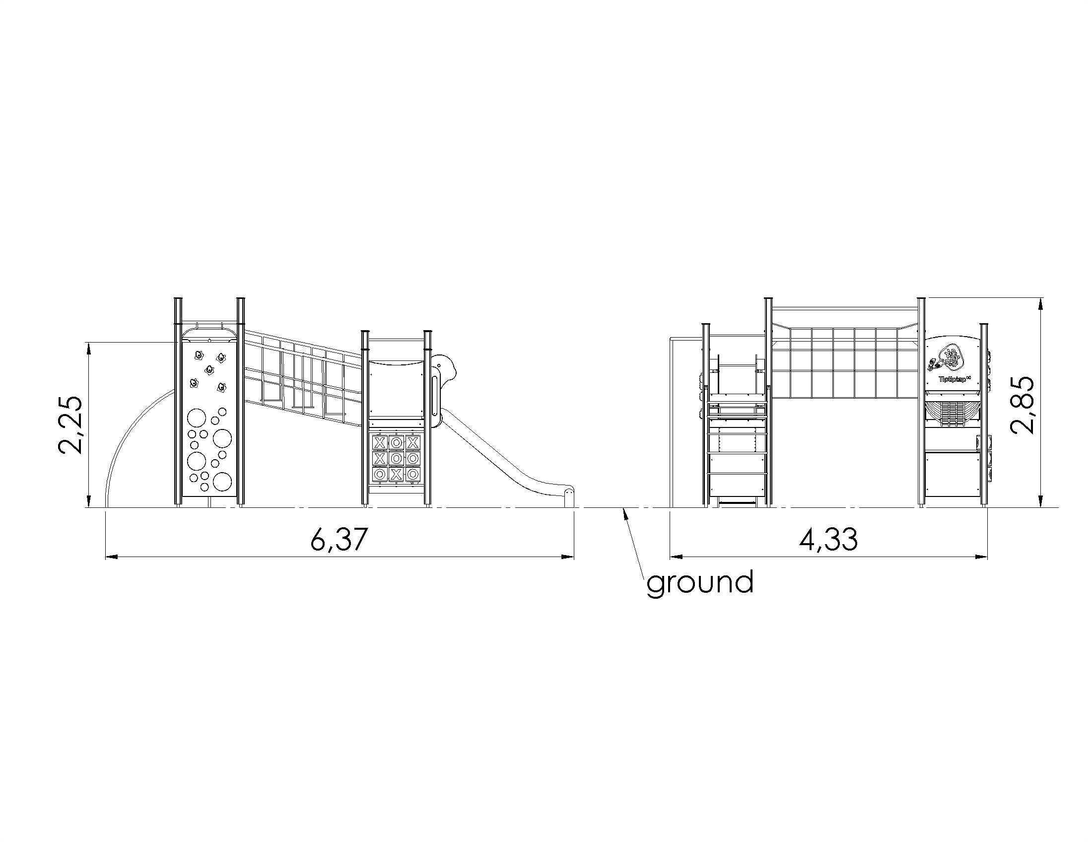 Play centre with four platforms for diverse and developing play. Various ladders lead up tot he platforms. A swinging bridge with handrails and swinging steps, a net tunnel and a sloping net bridge offer paths forward. A horizontal ladder challenges kids to move between the platforms without stepping down. The play centre comes equipped with a slide and a fireman’s pole. The side panels of the play centre can be switched for various activity walls or thematic printed panels (animals, birds, fish, trees, berries, etc.). The design of the panels will be finalised with the client during ordering.