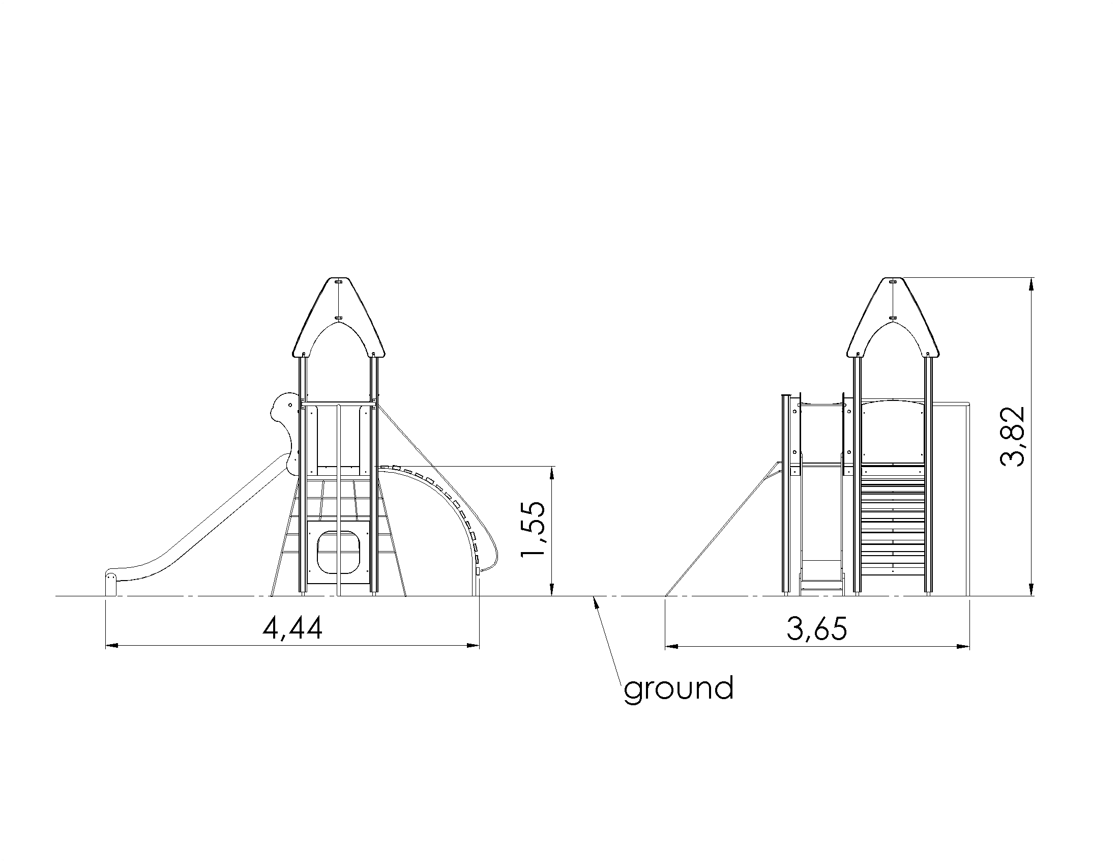 Play centre with two platforms, accessed via an arched path or a net slope. A slide a the fireman’s pole offer a way to slide down. The side panels of the play centre can be switched for various activity walls or thematic printed panels (animals, birds, fish, trees, berries, etc.). The design of the panels will be finalised with the client during ordering.