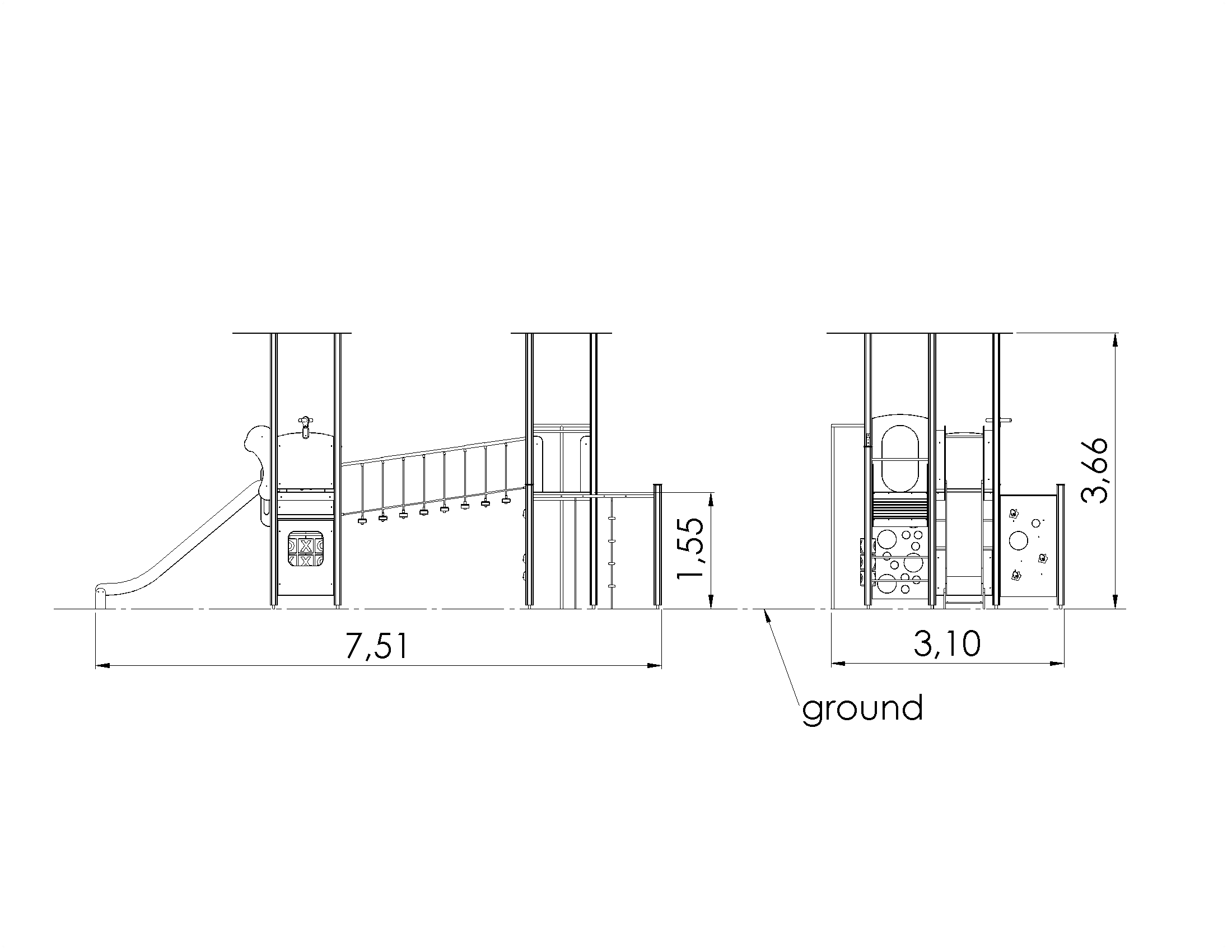 A play centre with three platforms, a slide and climbing walls. A small ladder leads to the first platform. A balance bridge with handrails and moving steps leads to the next platform, where a fireman’s pole offers a way down. The third platform comes with a slide that leads down. An attached climbing complex with net walls, climbing ropes and a rock climbing wall help kids practice climbing and balancing skills. A Tic-Tac-Toe game, binoculars, a captain’s helm and a play corner with car dashboard elements promote active play. The side panels of the play centre can be switched for various activity walls or thematic printed panels (animals, birds, fish, trees, berries, etc.). The design of the panels will be finalised with the client during ordering.