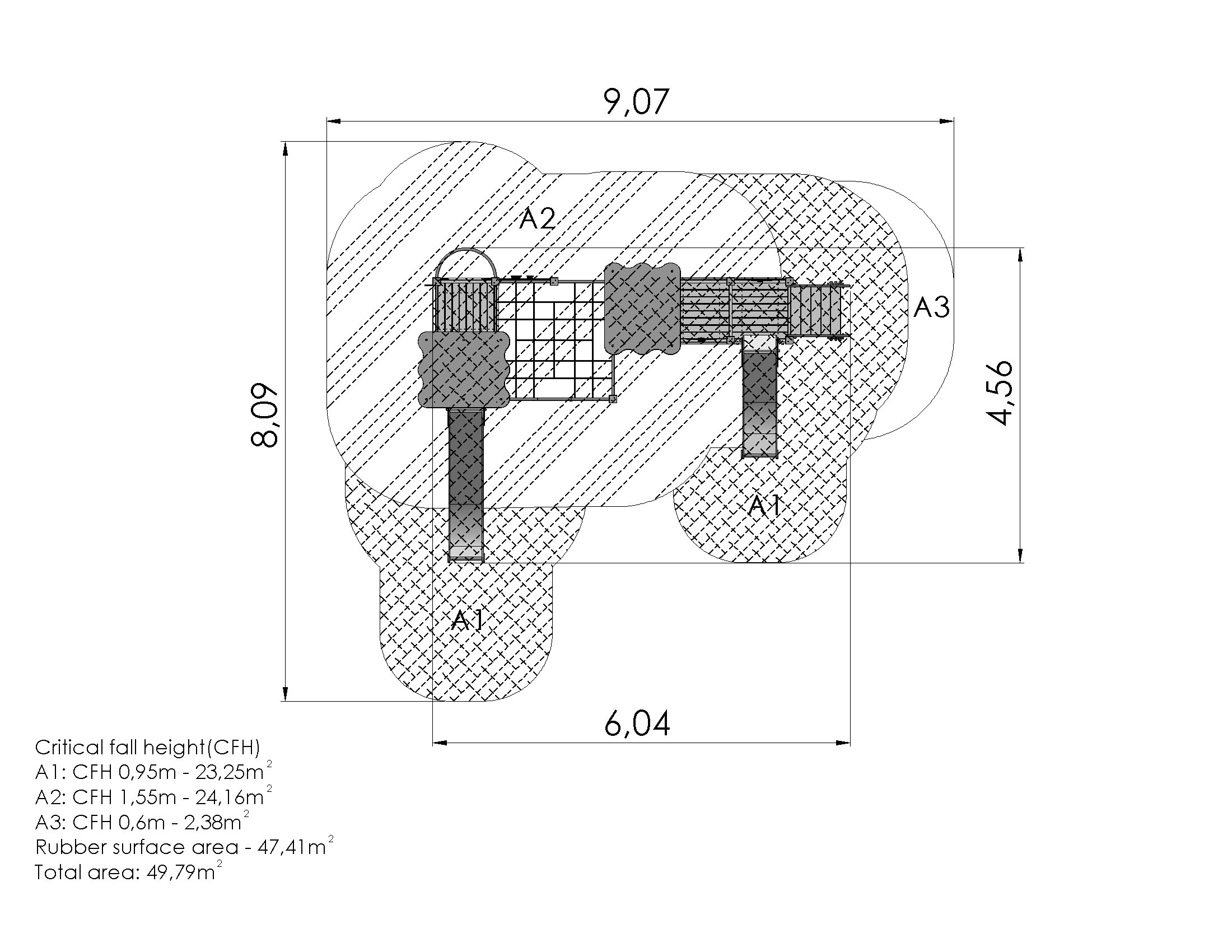 This play centre with its five platforms, two slides and several additional elements is well suited for diverse activities. Stairs with handrails lead to the lower platform, which is fitted with a slide. Platform side panels contain a clock with moveable hands and a turning wheel. Various ladders, rock climbing walls and climbing nets lead to the higher platforms. A slide and a fireman’s pole offer a way down from the highest platforms. An adjoined climbing complex with net walls, climbing ropes and a rock climbing wall allows the kids’ to put their dexterity and climbing skills to the test. Two binoculars and a play corner with a bench, which can be fitted with either kitchen or car dashboard elements add an extra layer of fun. The side panels of the play centre can be switched for various activity walls or thematic printed panels (animals, birds, fish, trees, berries, etc.). The design of the panels will be finalised with the client during ordering.