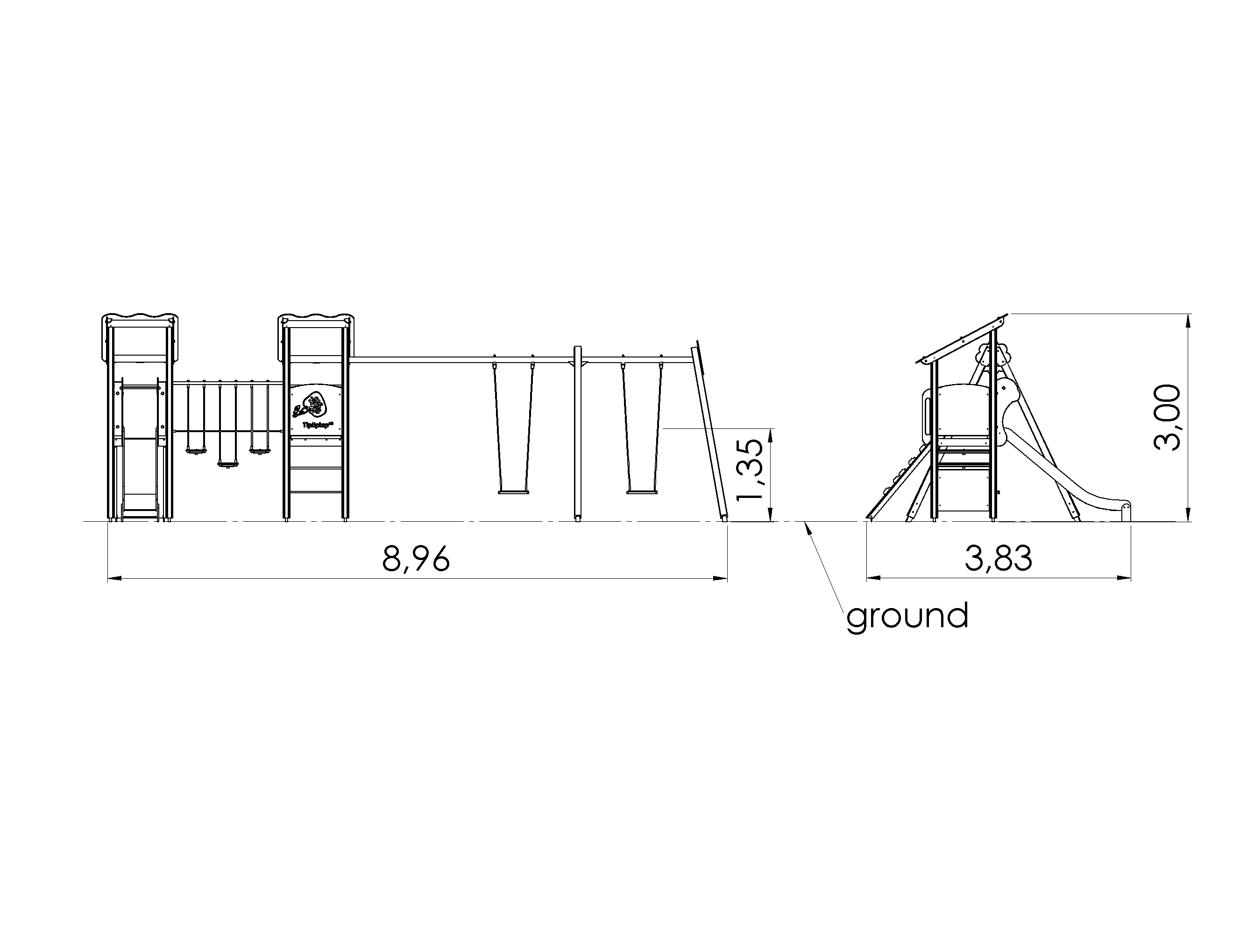 A versatile combined play centre with roofed platforms, a slide and two swing sets. A rock climbing slope and a ladder offer access to the platforms, which are connected by a balance bridge with handrails. A strong metal beam is attached to the play centre, which holds two aluminium reinforced rubber swing seats (swing sets KRK2 are included in the price of this product). The side panels of the play centre can be switched for various activity walls or thematic printed panels (animals, birds, fish, trees, berries, etc.). The design of the panels will be finalised with the client during ordering.