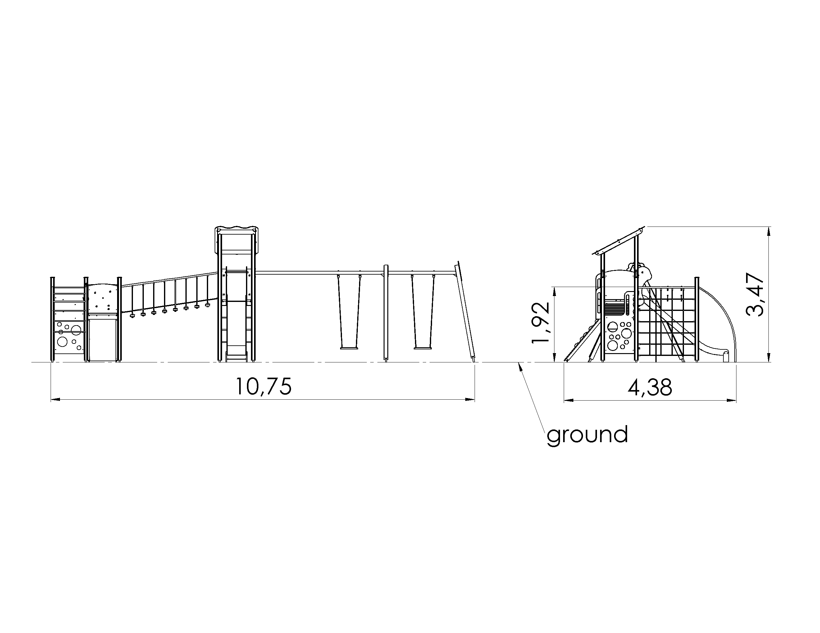 A versatile play centre with two platforms, a slide and two swing sets. A ladder and a rock climbing slope offer a way up to the platforms, a slide offers a way down from the higher platform. The platforms are connected by a balance bridge with moving steps. A strong metal beam is attached to the play centre, which holds two aluminium reinforced rubber swing seats (swing sets KRK2 are included in the price of this product). An adjoined climbing complex of several net walls, a horizontal ladder, a rock climbing wall and an arched ladder help develop dexterity and climbing skills. The side panels of the play centre can be switched for various activity walls or thematic printed panels (animals, birds, fish, trees, berries, etc.). The design of the panels will be finalised with the client during ordering.