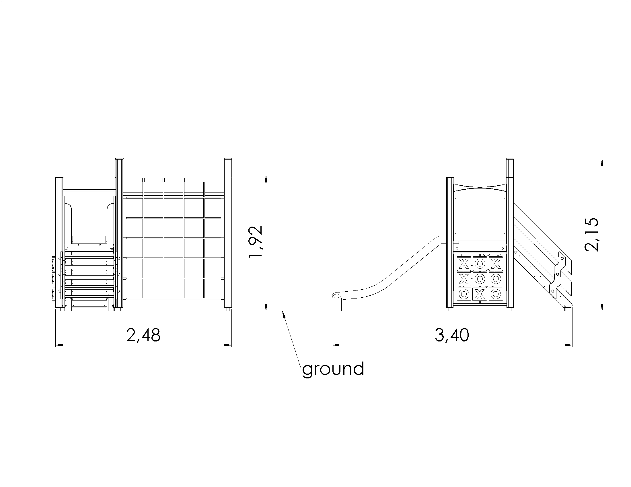 A toddler play centre with stairs with handrails, a climbing wall, a climbing net and a fun Tic-Tac-Toe game. The side panels of the play centre can be switched for various activity walls or thematic printed panels (animals, birds, fish, trees, berries, etc.). The design of the panels will be finalised with the client during ordering.