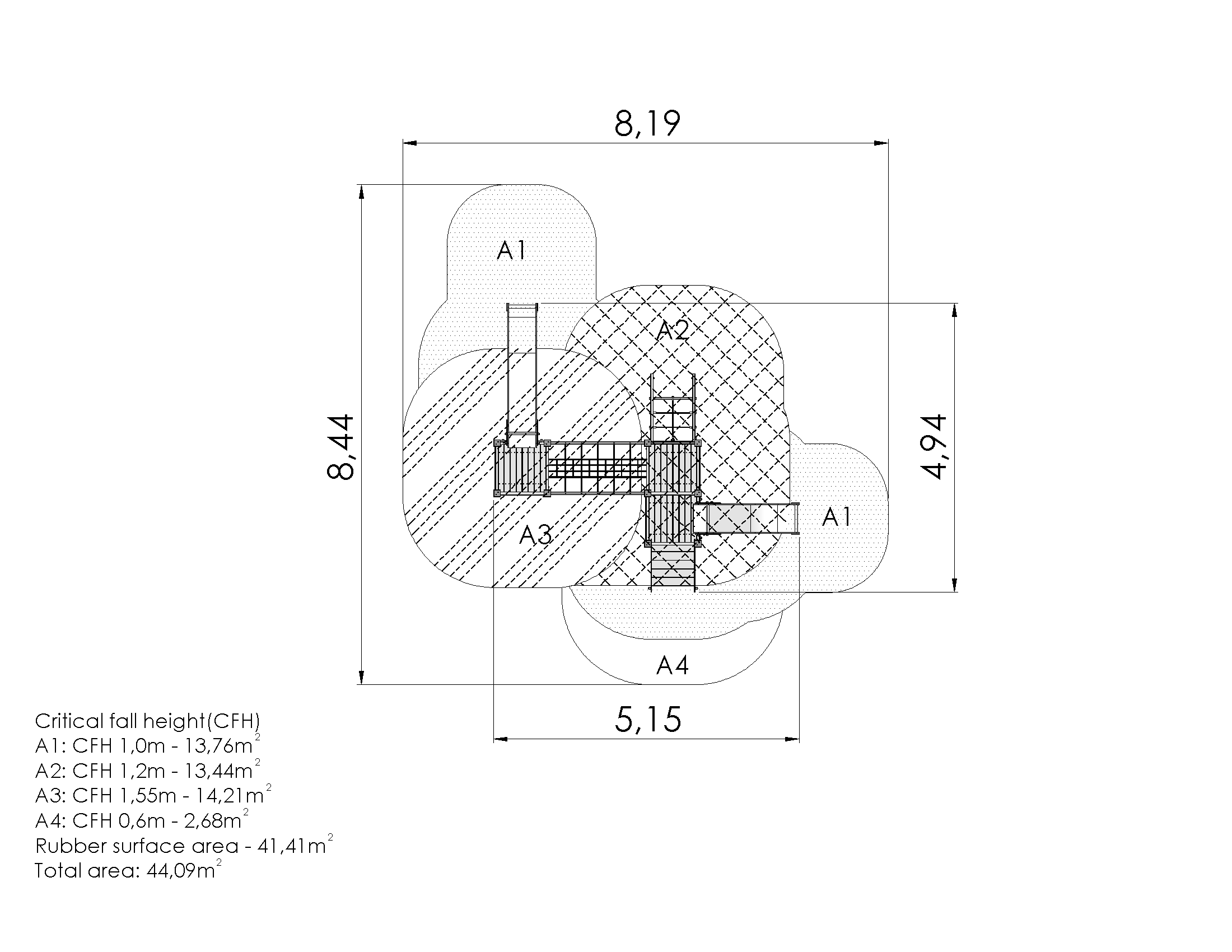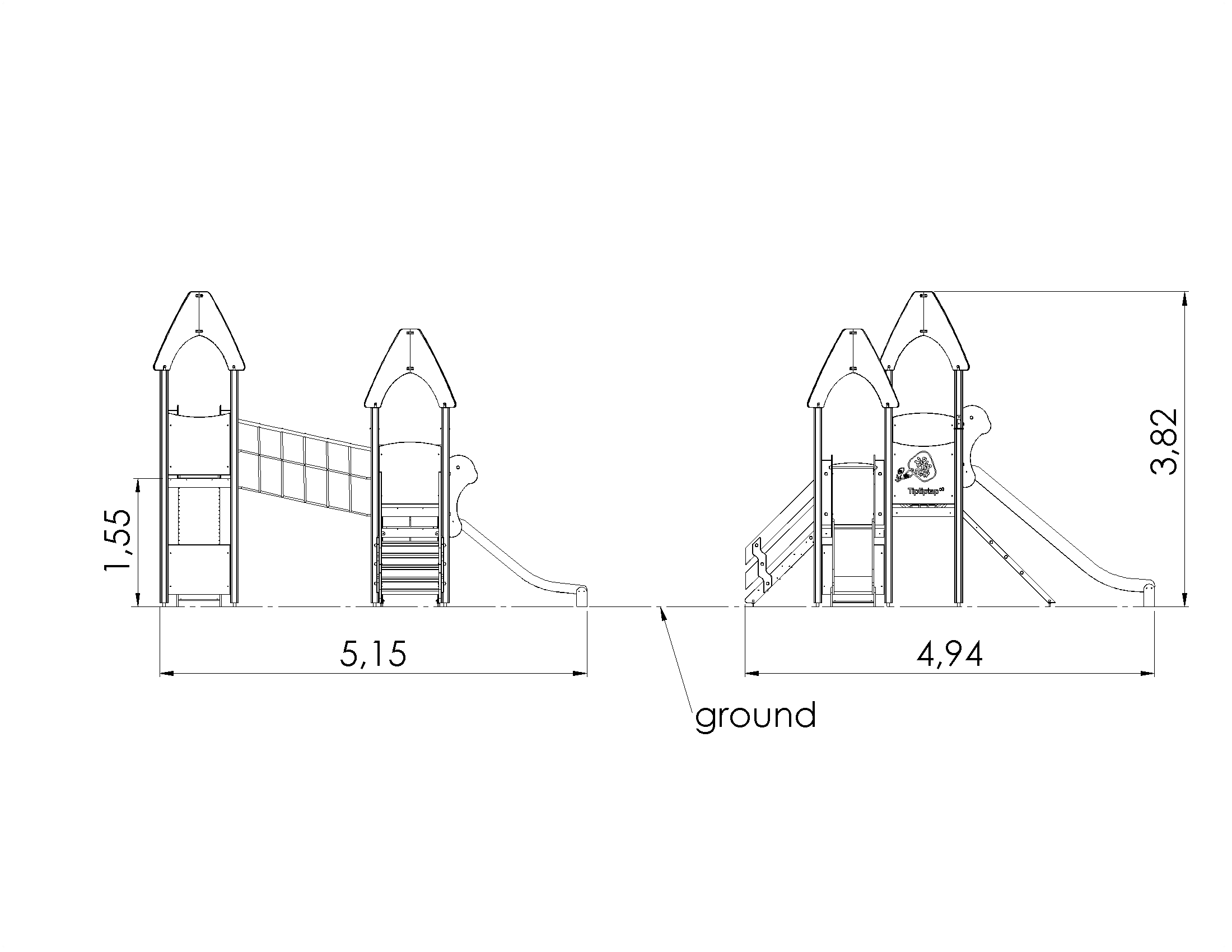 A play centre with three different level platforms, two of which have roofs, stairs with handrails, a net suspension bridge and a net climbing slope. The side panels of the play centre can be switched for various activity walls or thematic printed panels (animals, birds, fish, trees, berries, etc.). The design of the panels will be finalised with the client during ordering.