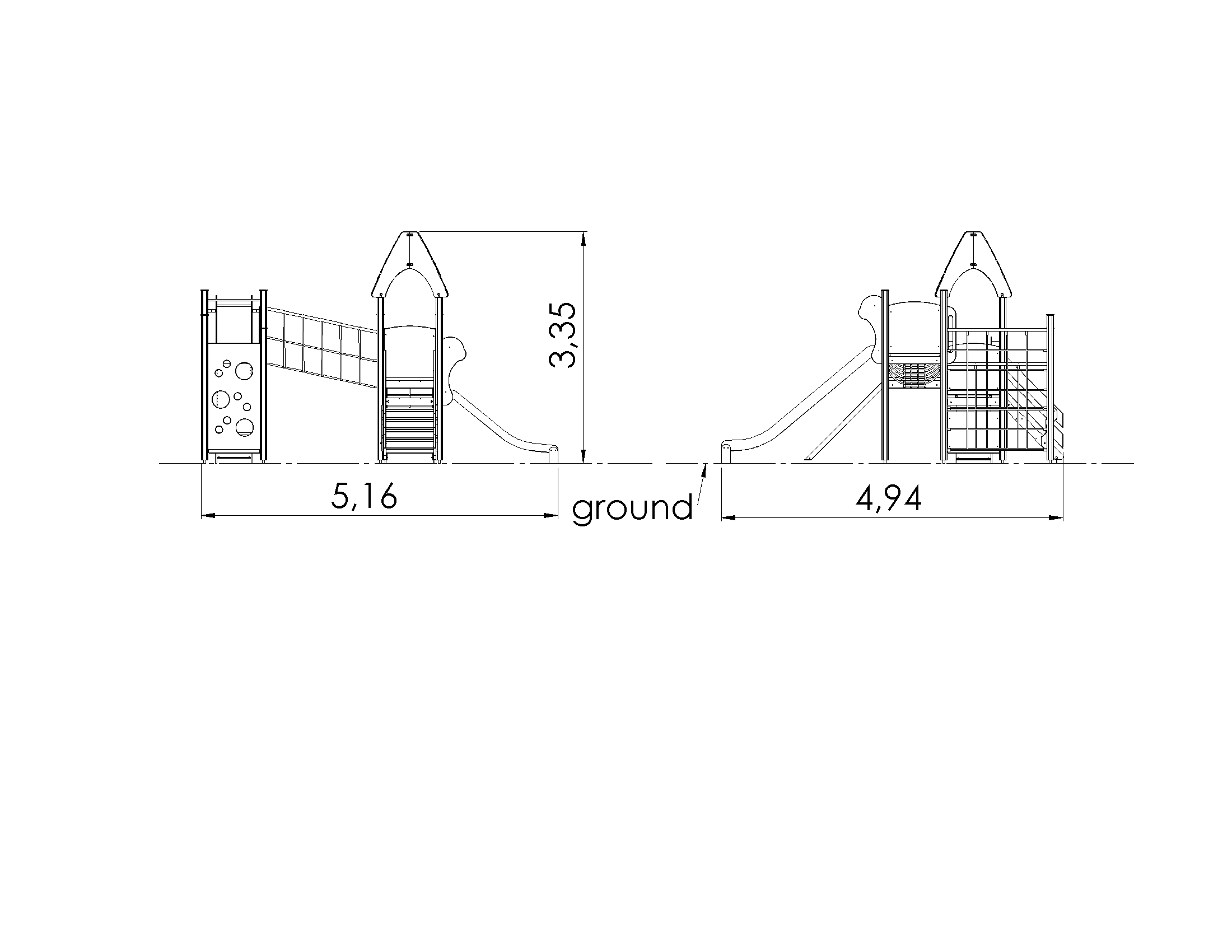 A play centre with three platforms of different heights, two slides, and climbing walls. Stairs with handrails and a climbing net slope lead to the centre. A net bridge with handrails leads to the highest platform. Two net walls, a ladder and a climbing wall with holes offer a chance to practice dexterity and climbing skills. Two slides provide a way down. The side panels of the play centre can be switched for various activity walls or thematic printed panels (animals, birds, fish, trees, berries, etc.). The design of the panels will be finalised with the client during ordering.