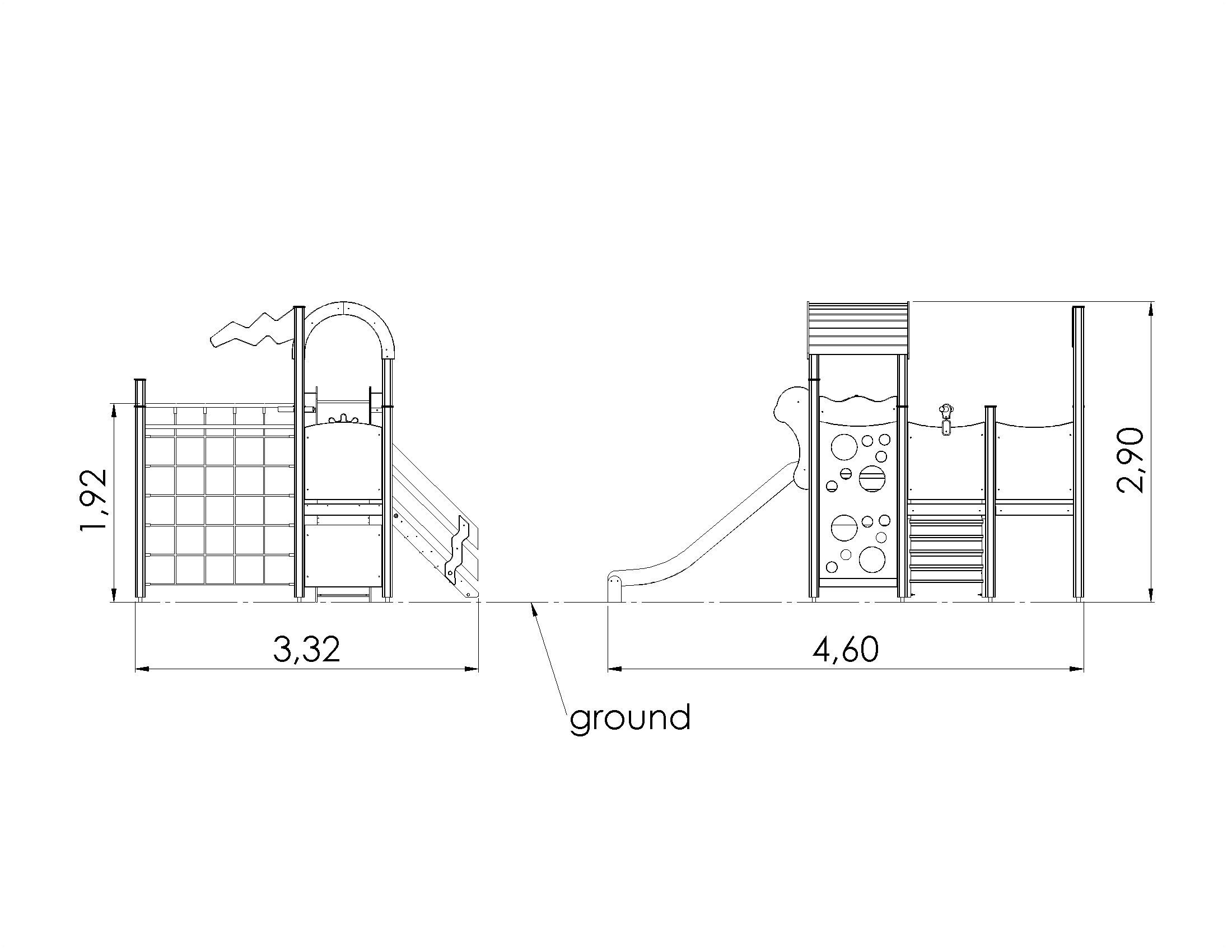 This play centre provides three platforms, stairs with handrails, a climbing net, a slide, a cross bar, and a climbing wall. Role playing needs will be met by a captain’s helm, binoculars and the fun play corner with a bench, hidden beneath the higher platform, which can be fitted with either kitchen corner or car dashboard elements. The side panels of the play centre can be switched for various activity walls or thematic printed panels (animals, birds, fish, trees, berries, etc.). The design of the panels will be finalised with the client during ordering.