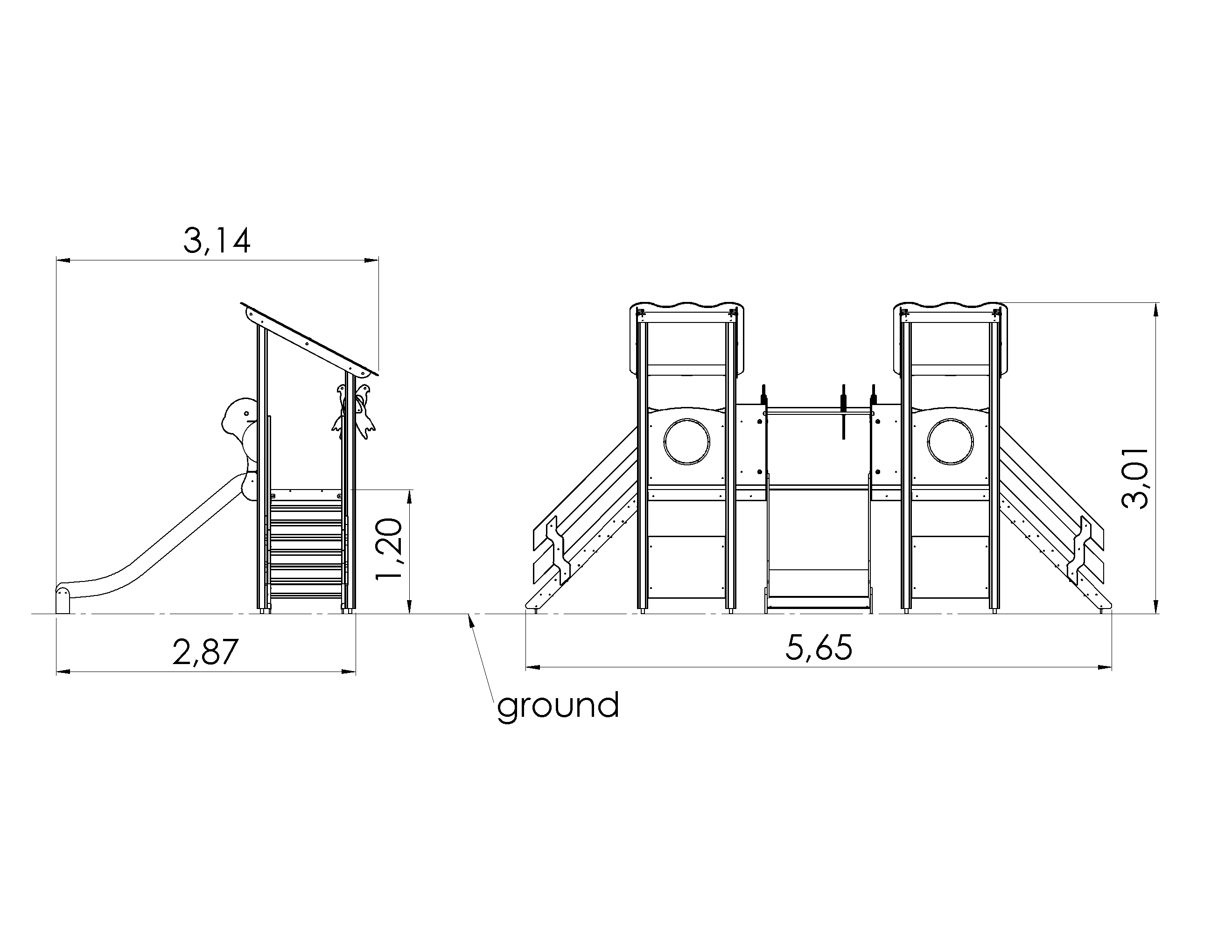 Double the fun with this play centre and its two platforms, two stairs with handrails, rustproof slides, sloped roofs and play corners. Kids can peek at the world through portholes and greet a flock of birds. The side panels of the play centre can be switched for various activity walls or thematic printed panels (animals, birds, fish, trees, berries, etc.). The design of the panels will be finalised with the client during ordering.