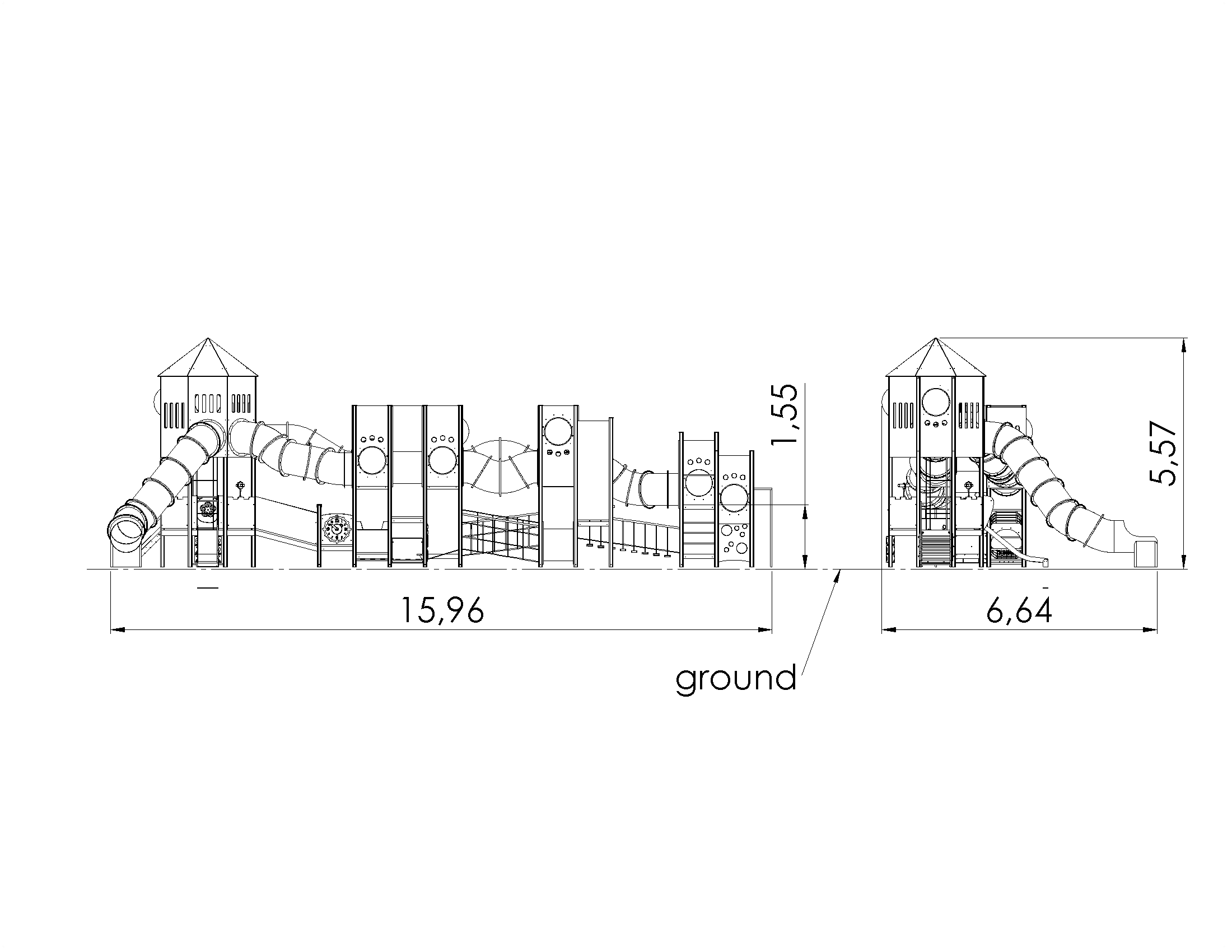 A two-tiered play centre with a large castle tower and activity elements is fully suited for developmental play and offers activities for children of various age groups. Stairs with handrails, ladders, climbing walls and platforms offer access to the play centre. The lower tier is created for toddlers and contains an abundance of elements that help develop their physical and motor skills. Stairs with handrails lead to the lower platform. To move on a balance bridge with moving steps, a net bridge, a sloping bridge or rock climbing wall have to be crossed. The lower play area is lined with moving and rotating activity walls, a clock, binoculars and several fine motor skills panels. A small and sturdy slide offers a way down. The playground for older children with its several platforms, tunnels, climbing walls and portholes is housed on the higher tier. The big, roofed platform offers two ways for sliding down: a tunnel slide or a fireman’s pole. The two floors of the castle tower are connected by a rope climbing element, which provides a challenging climb between the two levels. The lower level houses a fun play corner with a bench and either kitchen or car dashboard elements.