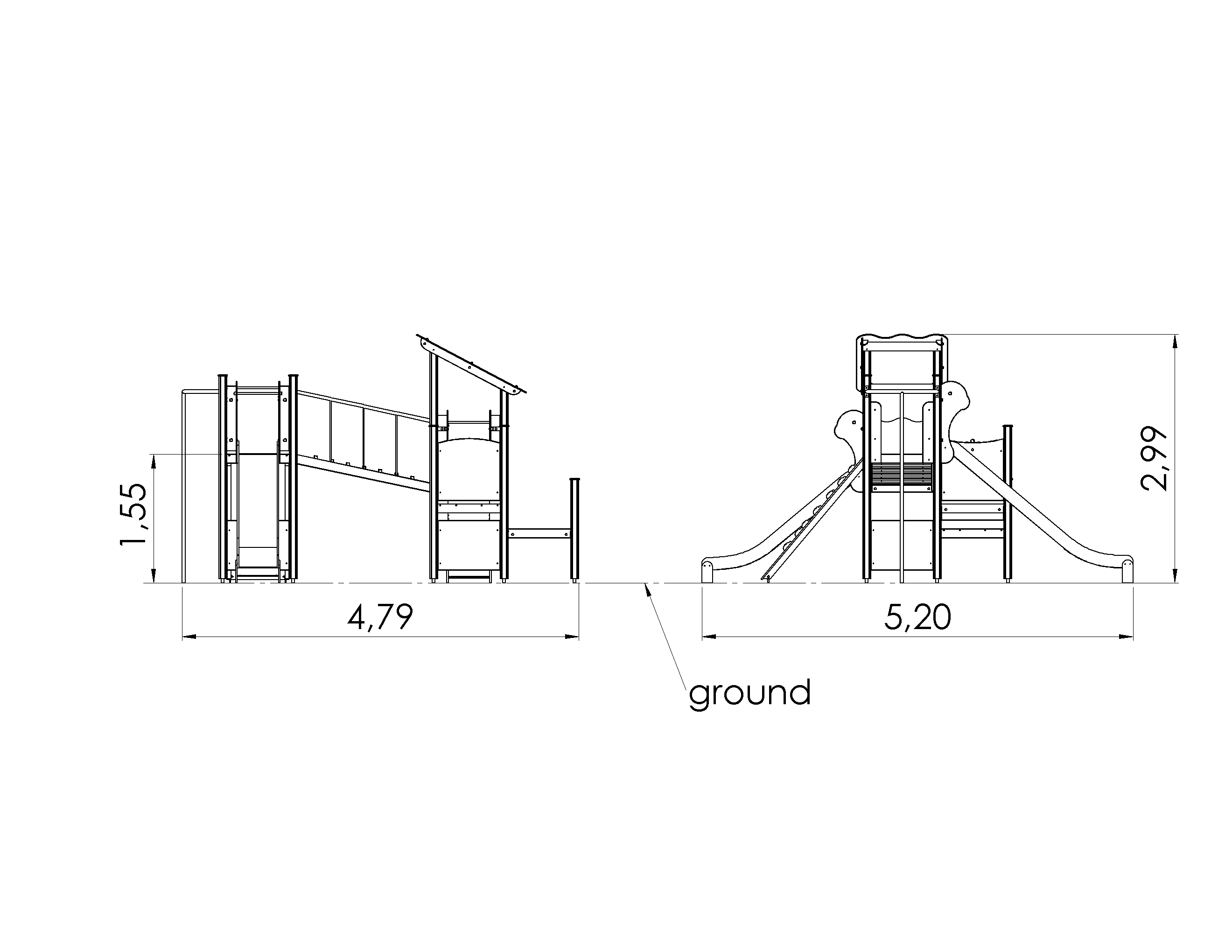 A play centre with four platforms, two slides, a bridge, a rock climbing slope, a fireman’s pole and a sloping roof. Lower platform offers access to the play centre, higher platform can be reached by a bridge or a rock climbing slope. The play centre comes equipped with a captain’s helm and a play corner with a bench, which can be fitted with either kitchen or car dashboard elements. The side panels of the play centre can be switched for various activity walls or thematic printed panels (animals, birds, fish, trees, berries, etc.). The design of the panels will be finalised with the client during ordering.
