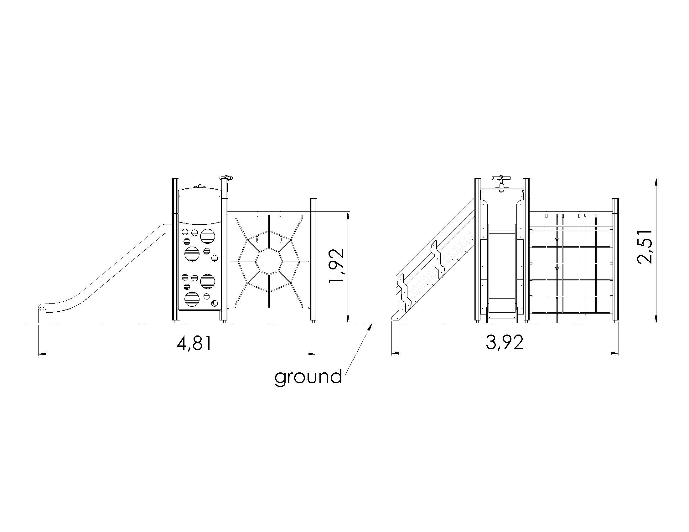 A play centre with a platform, a slide and various climbing elements. Stairs with handrails lead up to the centre. The integrated climbing complex, which houses several net walls, a climbing wall with holes and climbing ropes, allows practicing both climbing skills and dexterity. Binoculars, a captains helm and a play corner with car dashboard elements satisfy role playing needs. The side panels of the play centre can be switched for various activity walls or thematic printed panels (animals, birds, fish, trees, berries, etc.). The design of the panels will be finalised with the client during ordering.