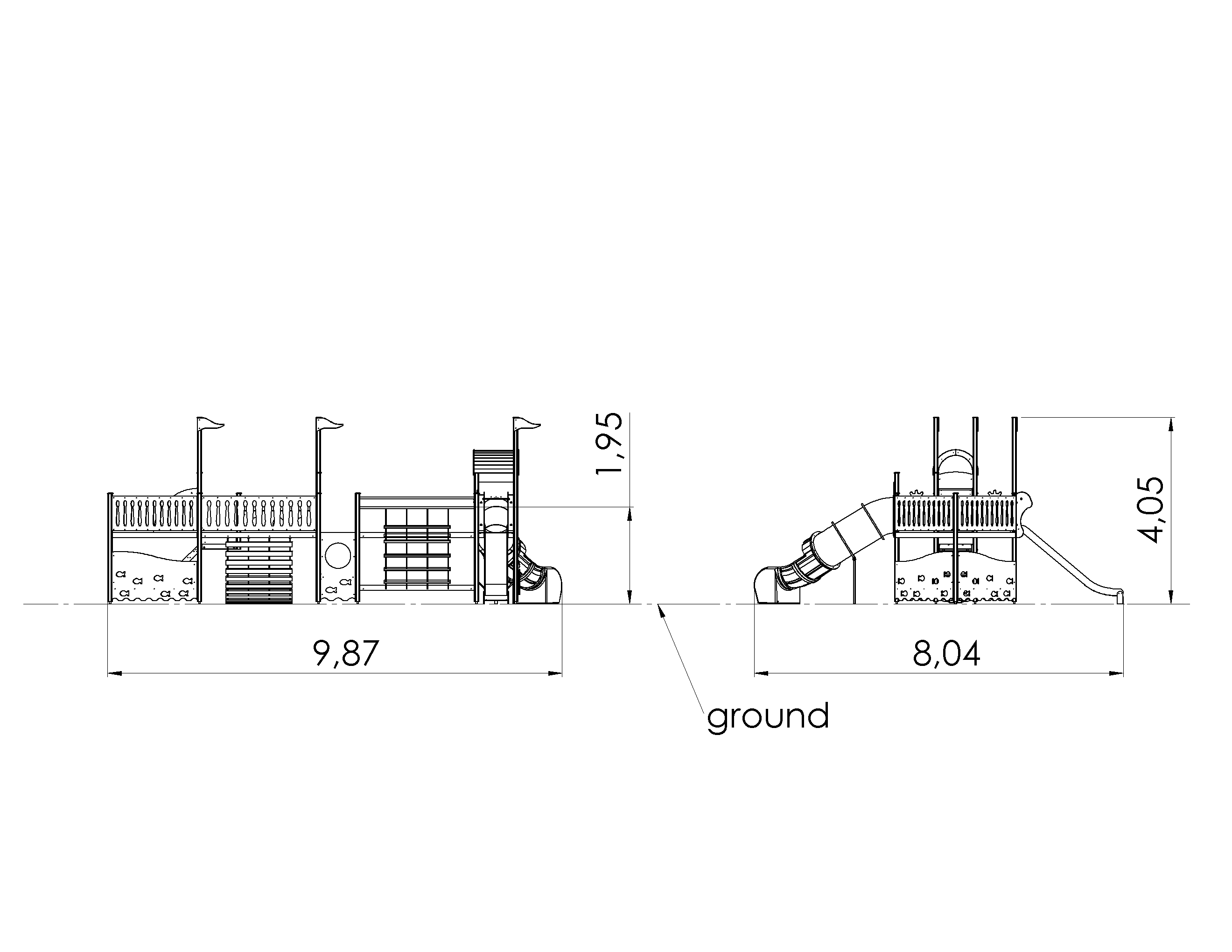 The large playship has two captain bridges that can accommodate up to 40 children at a time. A large group of children can play various role-playing games on the ship, run around, hang, jump and climb. You can board the ship’s deck via the climbing net, the climbing wall or use the stairs at the bow. To leave the deck, one can either slide down the 1.55 m tunnel slide or the slide. The hold of the ship is lined with nets of ropes. Climbing them makes you feel like you are swaying just like when sailing at sea. The playship also has two steering wheels for versatile activities and by steering them, you make the propellers rotate. There are also illuminators offering a good view of the sea and a crank in the nose of the ship that rotates the propeller.