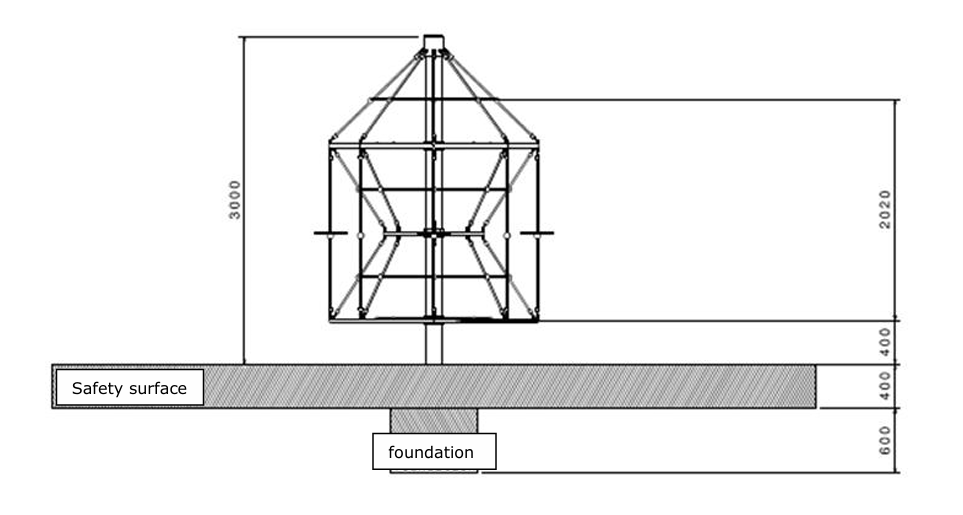 The revolving climbing tower consists of a hot-dip galvanised, powder-coated metal post that is to be concreted into the ground and of a strong climbing structure made of PP-coated ropes with a 16 mm steel core that are attached to the post.