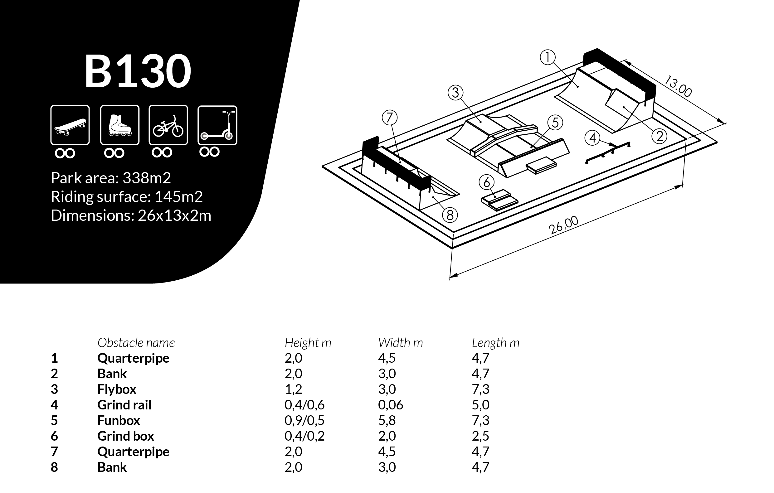 Home / Products / Skateparks / Ready-made solutions / Skatepark L26 x W13 x H2