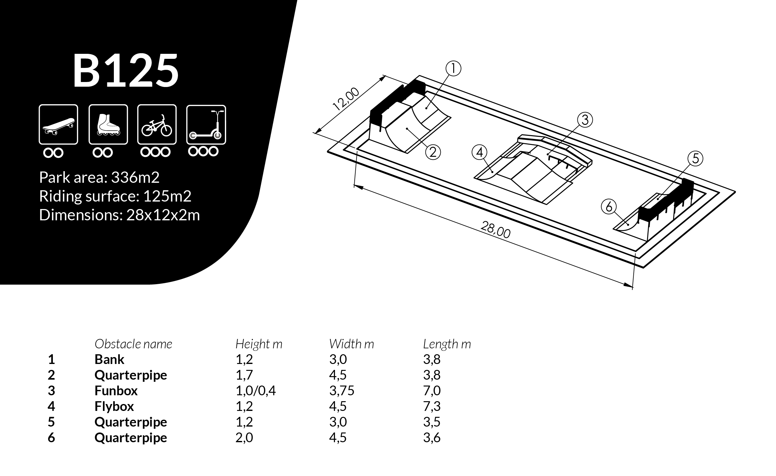 Home / Products / Skateparks / Ready-made solutions / Skatepark L28 x W12 x H2