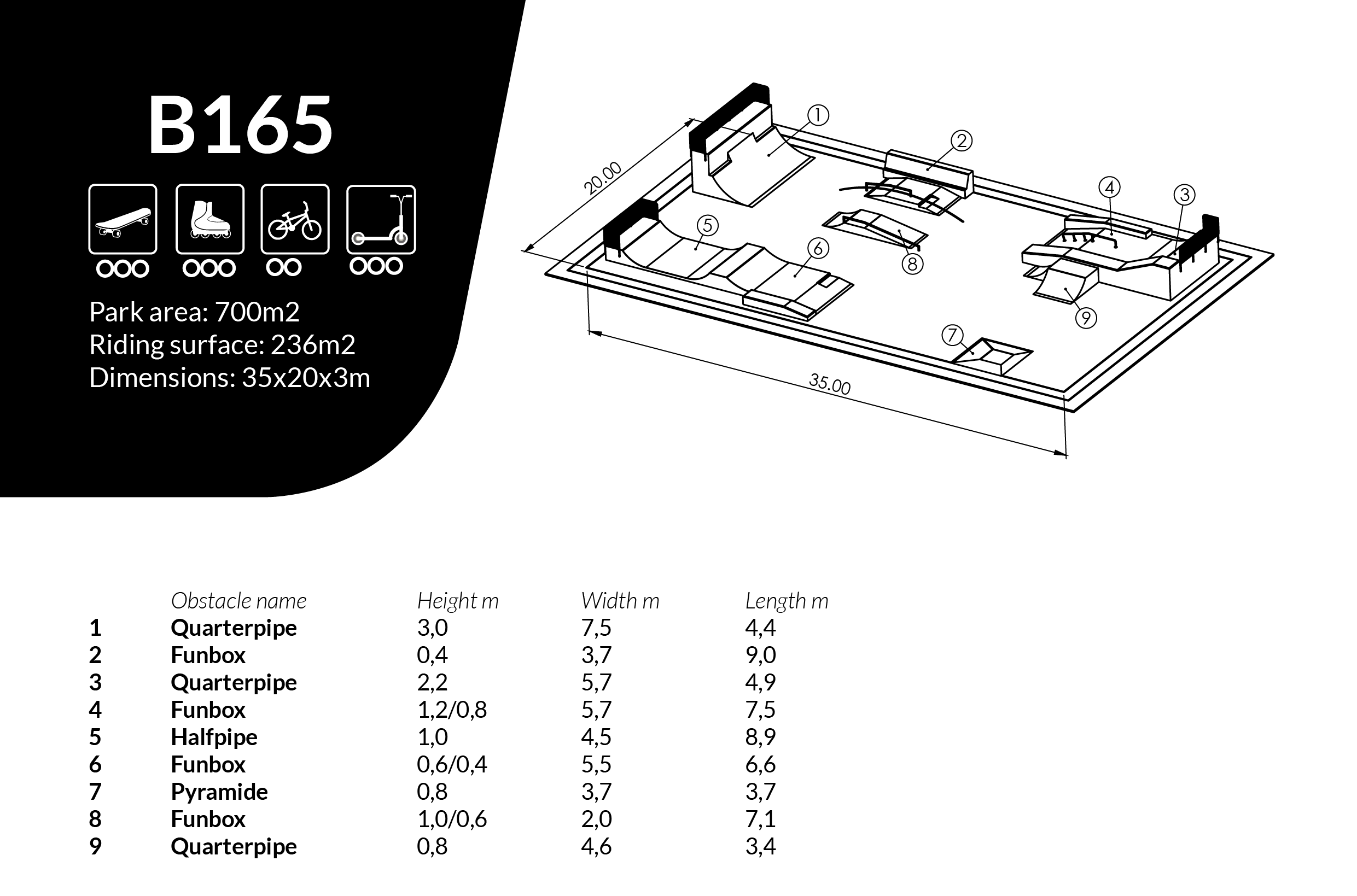 Home / Products / Skateparks / Ready-made solutions / Skatepark L35 x W20 x H3