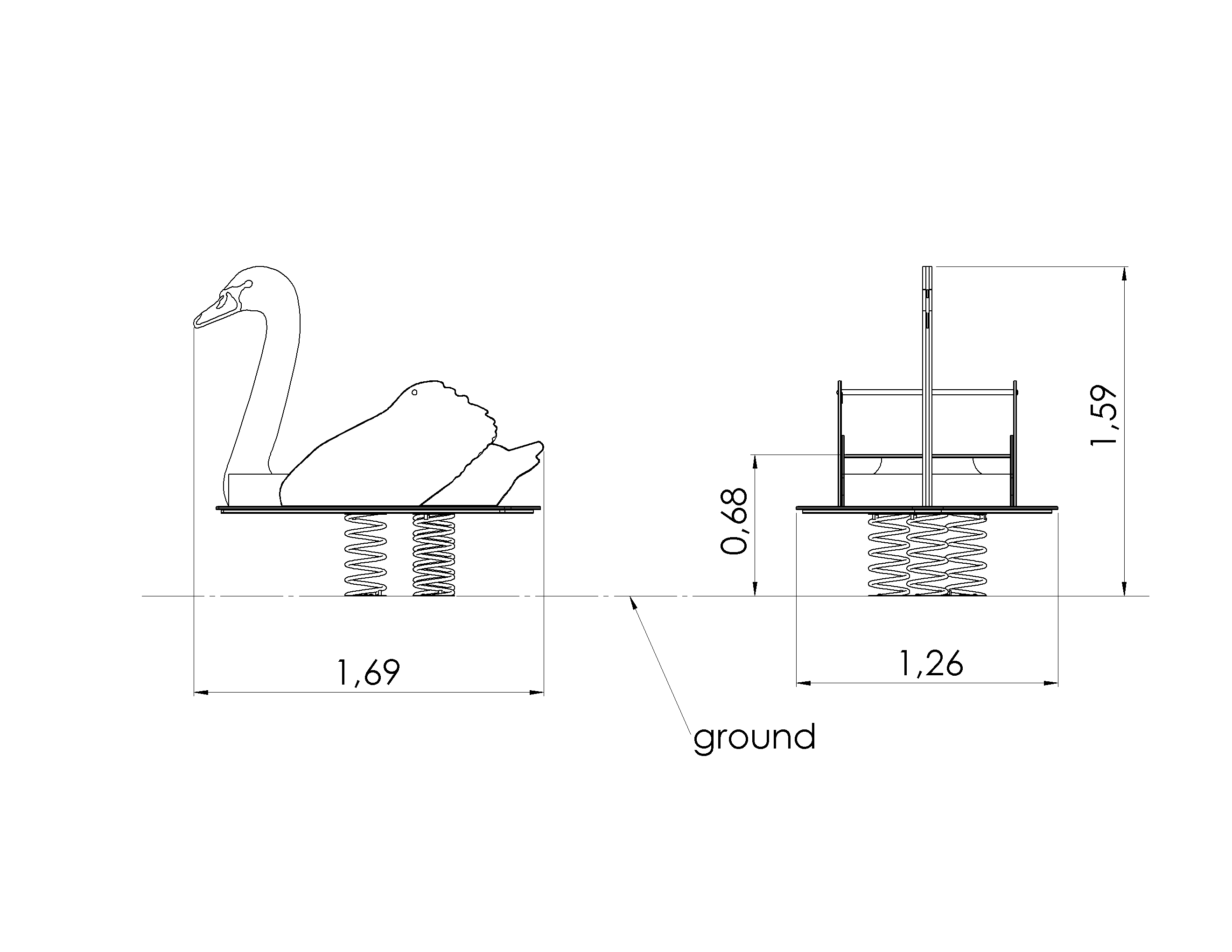 The springs are made of galvanized and powder coated steel. Platform has two layers – lower layer is made of waterproof plywood and top layer of HDPE. Swan shape is made of 15 mm HDPE. Product’s ground fixings are made of hot-dip galvanized metal and as standard solution it is concreted into the ground.