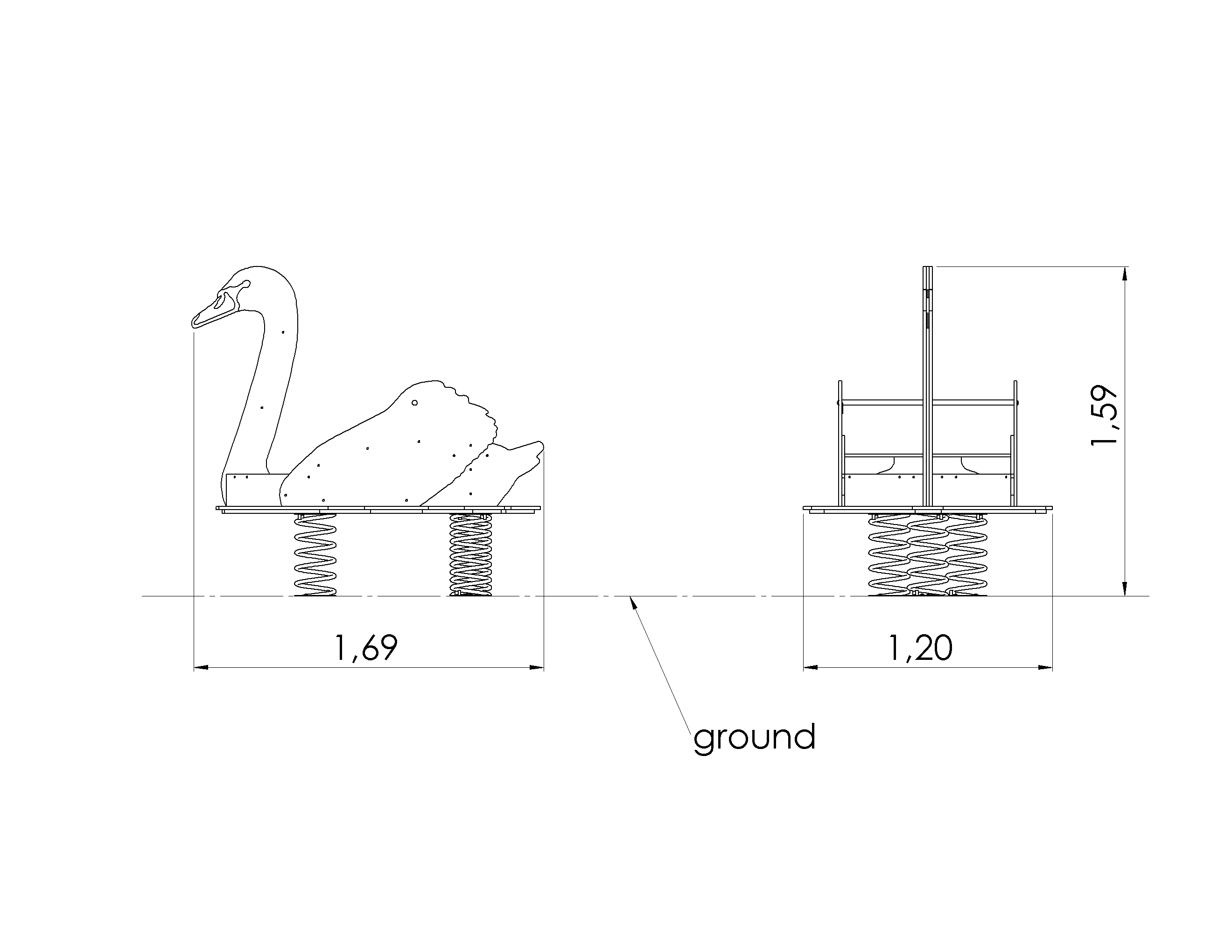The springs are made of galvanized and powder coated steel. Platform has two layers - lower layer is made of waterproof plywood and top layer of HDPE. Swan shape is made of 15 mm HDPE. Product’s ground fixings are made of hot-dip galvanized metal and as standard solution it is concreted into the ground.
