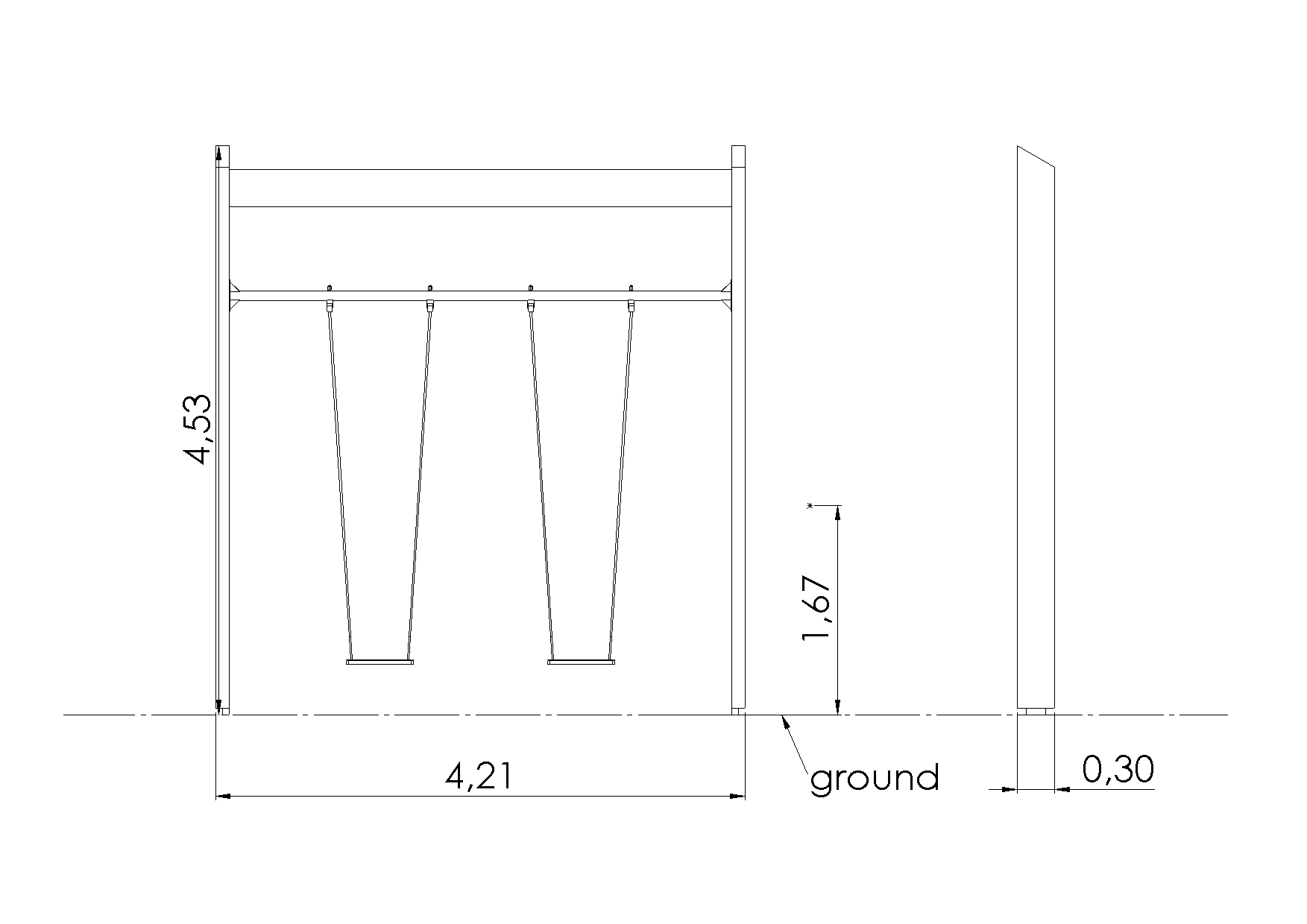 A high 2-user swing set featuring a Nordic design with a massive glued laminated wood construction and a galvanised metal beam (Wide adult seats KRK2L, with chains and fittings, are included in the set.).