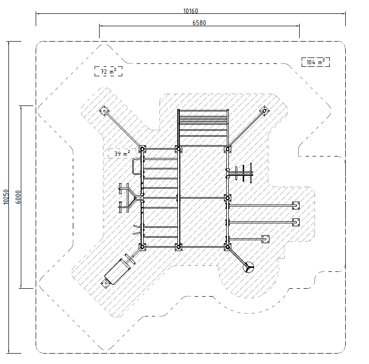 The product consists of: triple parallel bars, a vertical and a horizontal ladder, a trapeze, a monkey bar, a sit up bench, a tube, a push-up bar, chin pull and back muscle bars of different grip widths and directions, a punch bag. The construction of the device is made of vertical steel profiles measuring 80 x 80 mm with a wall thickness of 5 mm, and the training devices are attached to it with a bolt connection. Material: Powder-coated metal; hot-dip galvanised and powder-coated on request. The equipment is fixed to the ground by concreting, and an anchor bolt connection is available as a special solution. The set is TÜV certified according to the standard EN 16630: 2015.