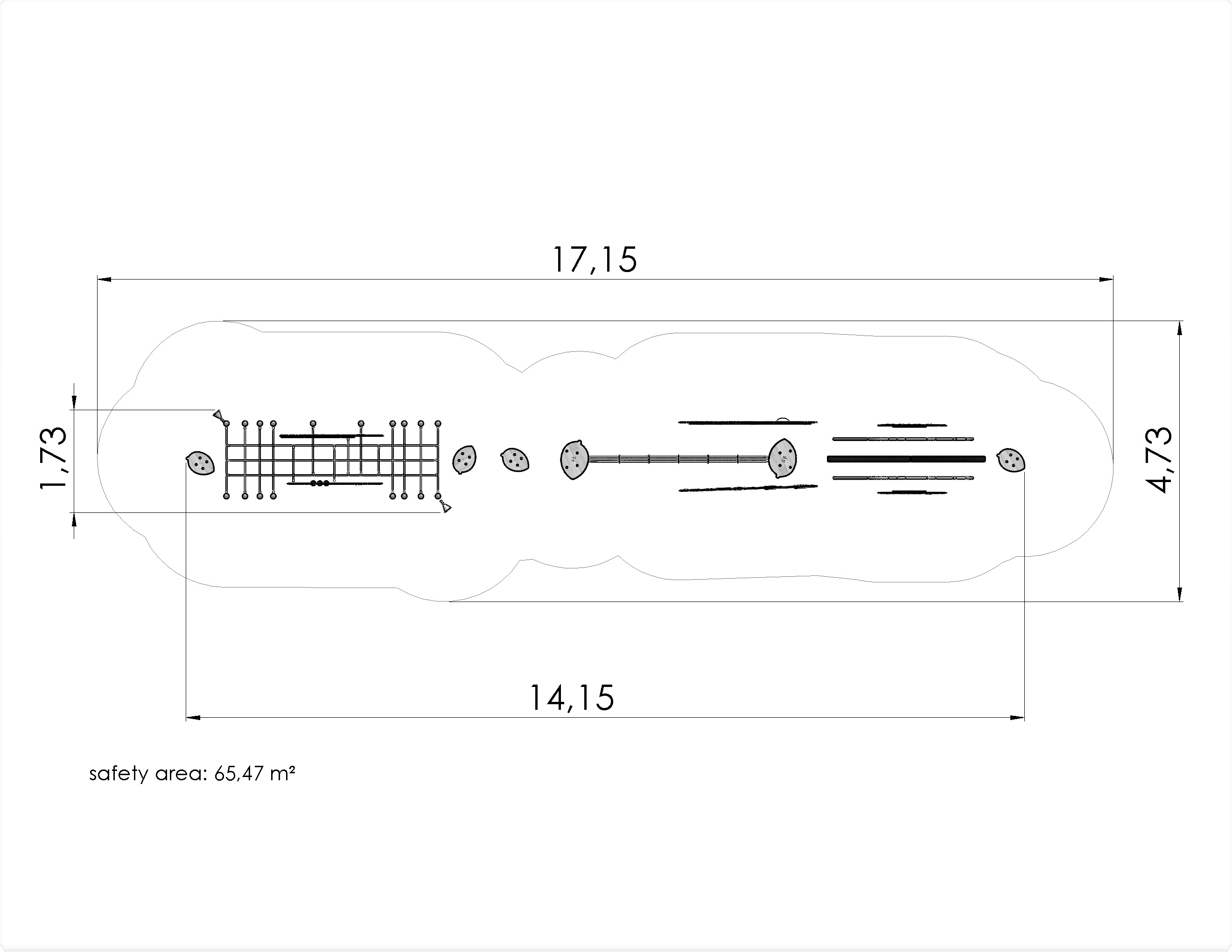 Tasakaalu- ja tegevusrada sisaldab tasakaaluvõrku, lehtede kujulisi tasakaalustusastmeid, slackline'i ja käsipuudega tasakaalupoomi. Rajal on 8 erinevat hirve tegeluspaneelidega: trips-traps-trull, mäng neli-ritta, illuminaator ja geomeetrilised kujundid. Kaks esimest hirve on ümbritsetud erineva kõrgusega metallpostidega, mis jätab mulje, et nad on metsas. Mõlemal pool metsa on kõnetorud.