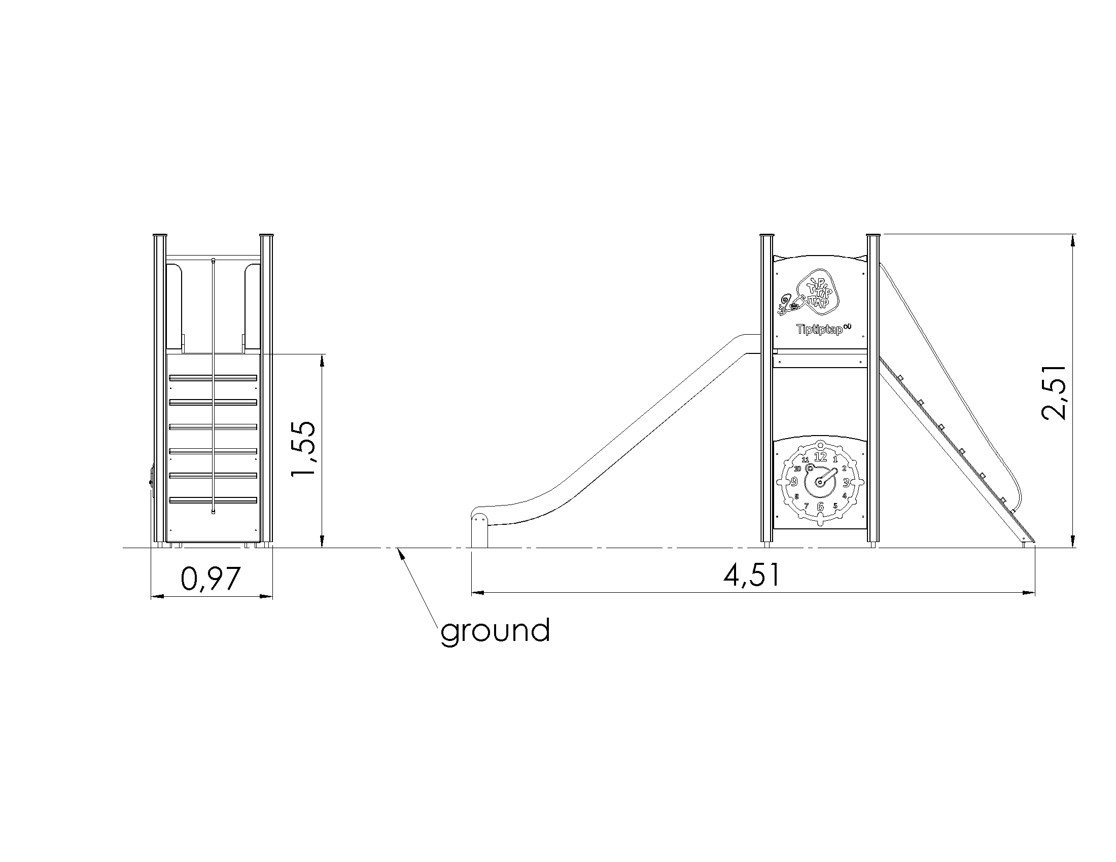Liumägi liurenni ja astmetega kaldteega. Platvormi all on vahva mängunurk, kuhu saab valida istepingiga kööginurga või autojuhikabiini elemendid. Mängunurga välisküljel on tegeluspaneel kella õppimiseks. Linnaku külgpaneele on võimalik vahetada erinevate tegeluspaneelide või temaatiliste prinditud paneelide vastu (loomad, linnud, kalad, puud, marjad jne), mille täpsed kujundused kooskõlastame kliendiga tellimuse käigus.