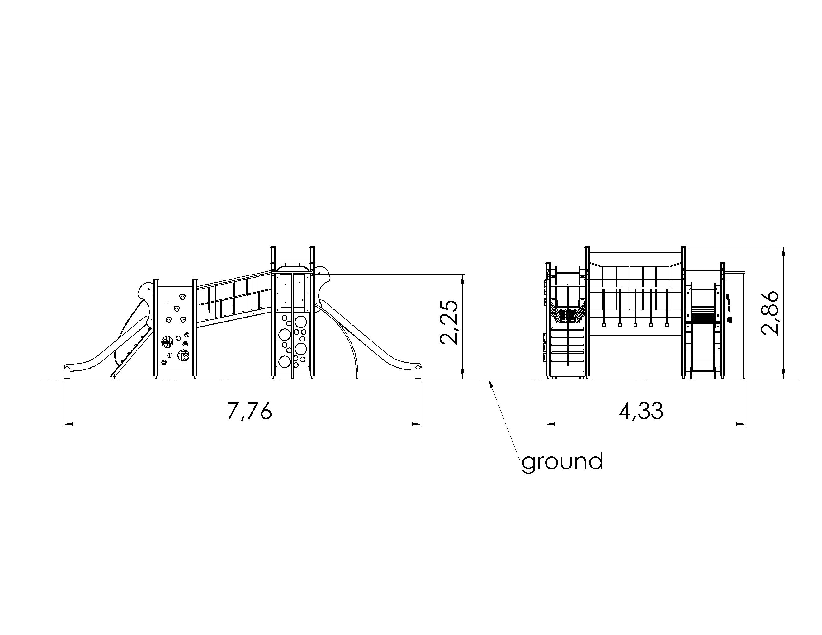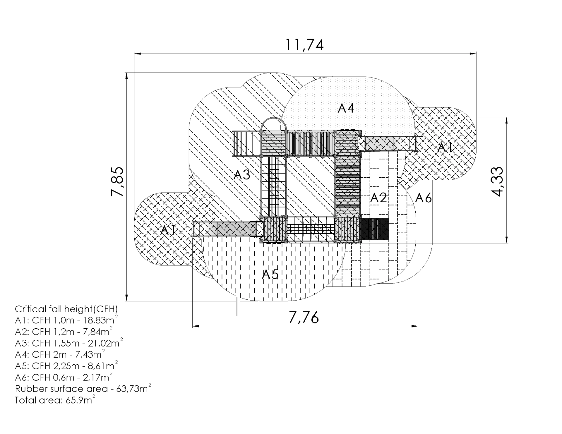 Nelja platvormiga mängulinnak sobib mitmekülgseks arenguks ja erinevateks tegevusteks. Linnakule pääseb mööda astmetega kaldteed või kaarredelilt. Kaks ronimisseina, võrktunnel, kettidel tasakaalurada, köisrippsild, kaks liurenni, tuletõrjetoru ja tegelussein pakuvad kuhjaga aktiivset liikumist ja mängurõõmu. Linnaku külgpaneele on võimalik vahetada erinevate tegeluspaneelide või temaatiliste prinditud paneelide vastu (loomad, linnud, kalad, puud, marjad jne), mille täpsed kujundused kooskõlastame kliendiga tellimuse käigus.