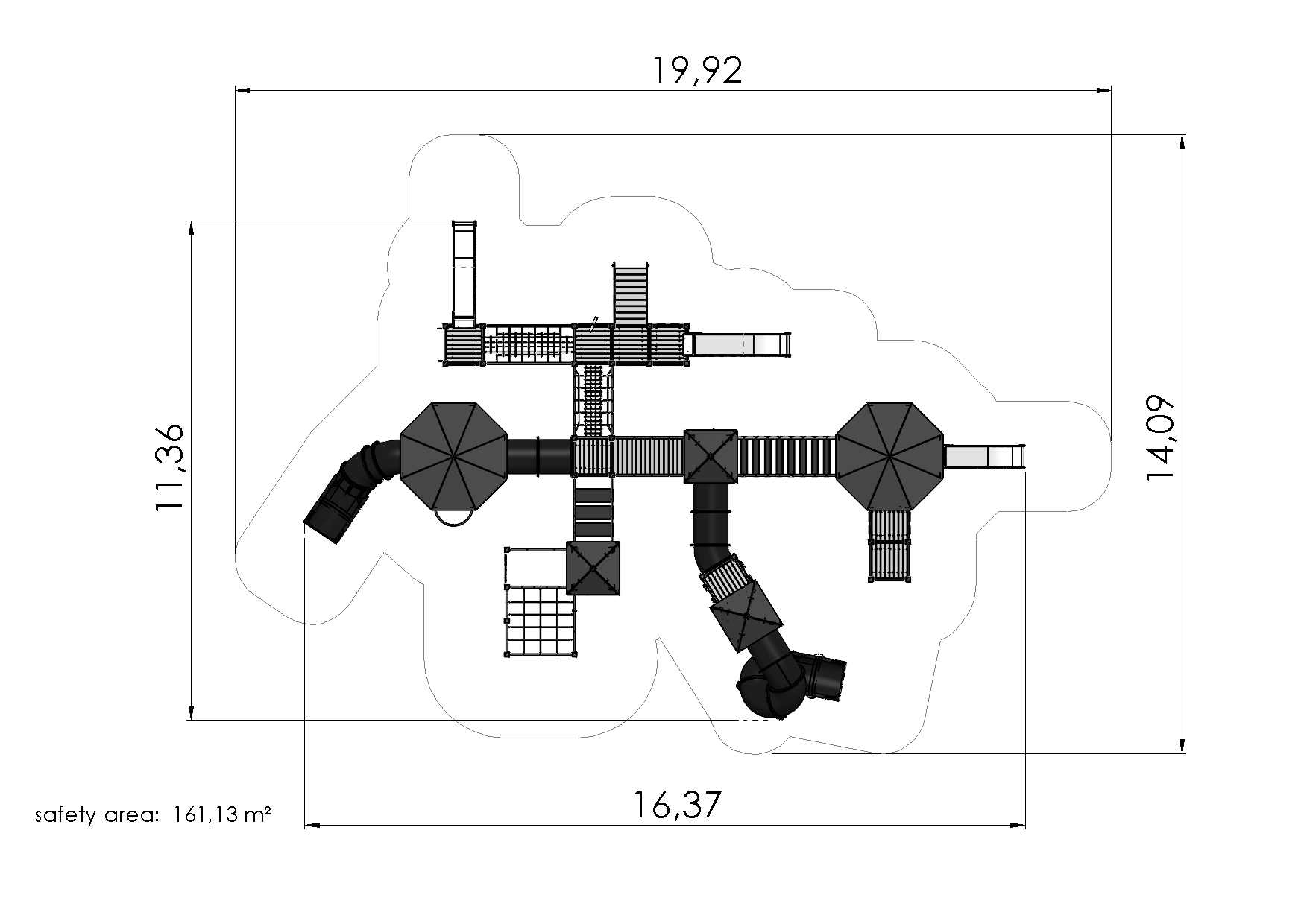 Mitmekülgset tegutsemist võimaldav, osavuselementidega pikitud kompleksne mängulinnak, kuhu pääsemiseks on käepidemetega trepp, redelid ja platvormid. Tootel on 9 erineva suuruse ja lahendusega platvormi (5 katusega). Kaks kindlusetorni stiilis suurt platvormi on toredad vahepeatused. Platvormide vahel liikumiseks saab kasutada kõikuvate astmetega silda, kinnist tunnelit, võrktunnelit, köissilda, ühendussilda jne. Liulaskmiseks on 2 liurenni ja 2 kinnist liutoru. Lisaks on osavust, tugevust, tasakaalu ja koordinatsiooni arendavad võimlemiselemendid: horisontaalne ja vertikaalne võrksein, redelid, avadega ronimissein ja ronimisköied. Platvormide all on kolm mängunurka: istepingiga kööginurk ja autojuhikabiini elemendid. Linnaku külgpaneele on võimalik vahetada erinevate tegeluspaneelide või temaatiliste prinditud paneelide vastu.