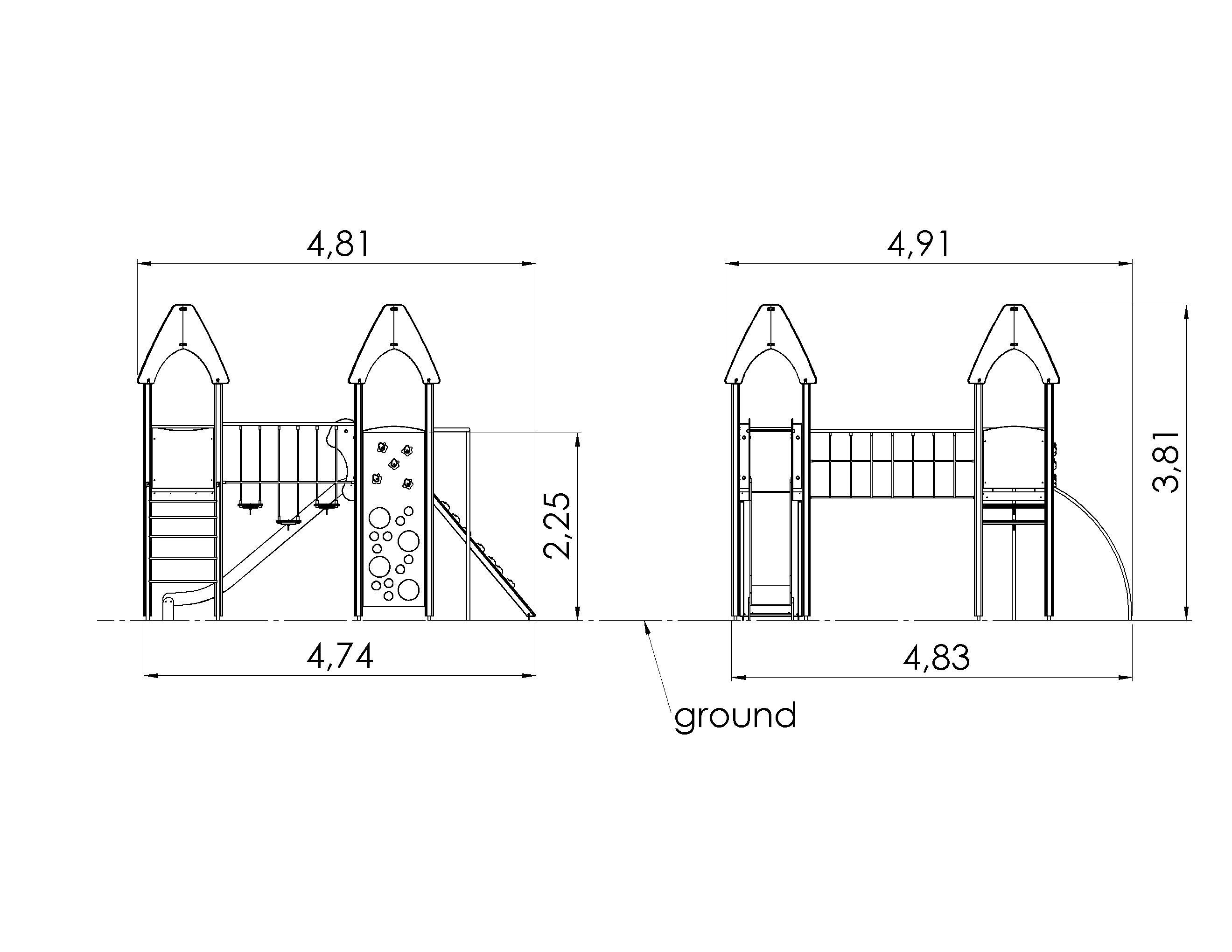Kolme platvormiga mängulinnak, millele pääseb mööda ronimiskividega kaldteed või kaarredelit. Linnaku platvorme ühendavad liikuvate astmetega ühendussild ja käsipuudega võrksild, lisaks on tootel liurenn, tuletõrjetoru ja vertikaalne ronimissein. Linnaku külgpaneele on võimalik vahetada erinevate tegeluspaneelide või temaatiliste prinditud paneelide vastu (loomad, linnud, kalad, puud, marjad jne), mille täpsed kujundused kooskõlastame kliendiga tellimuse käigus.