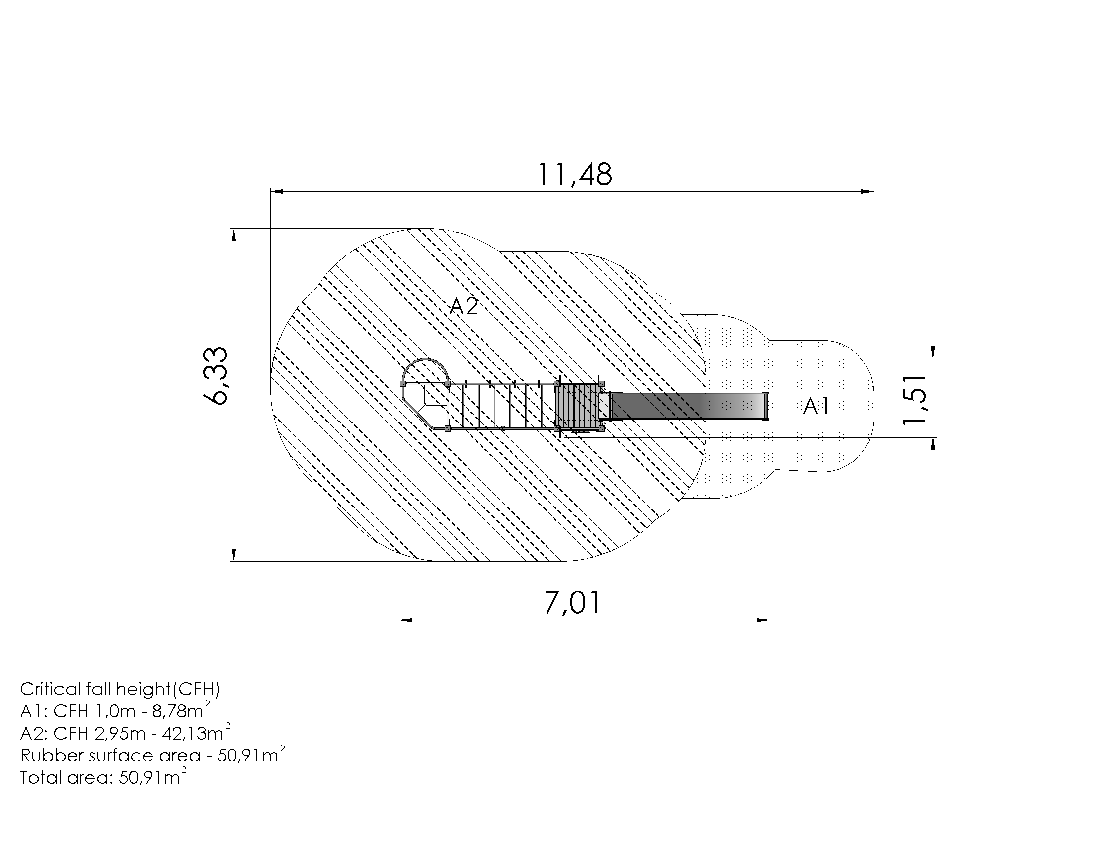 Kahe platvormi (neist üks võrgust), liurenni ja rippredeliga mängulinnak. Linnaku platvormidele pääseb mööda erinevaid redeleid ja kividega ronimisseina. Suurt väljakutset pakub kahe platvormi vahel olev rippredel, mille abil jalgu maha panemata kahe platvormi vahel liikuda või milleni ronimisköie abil üles ronida. Liulaskmiseks on linnakul liurenn või saab end ülevalt alla libistada tuletõrjetoru abil.