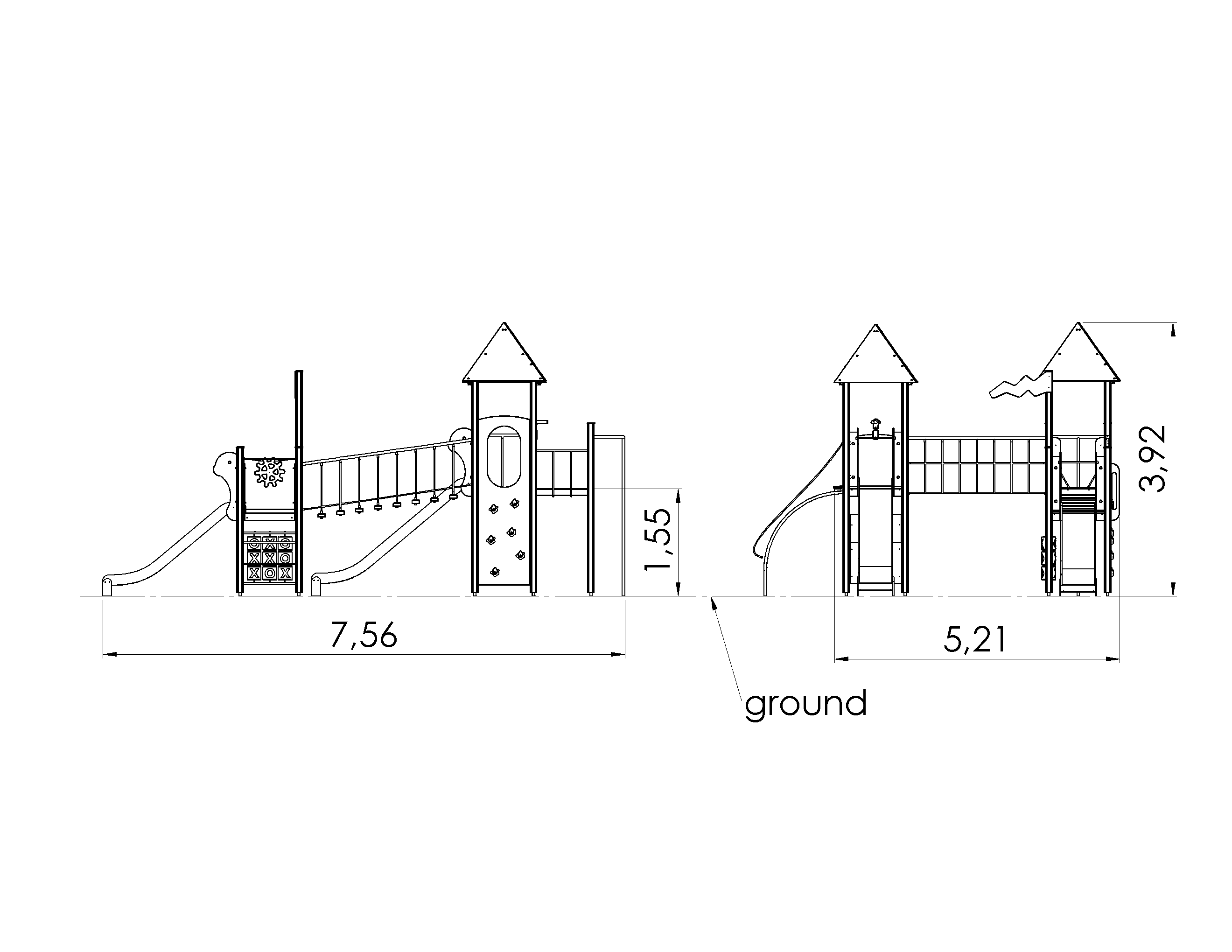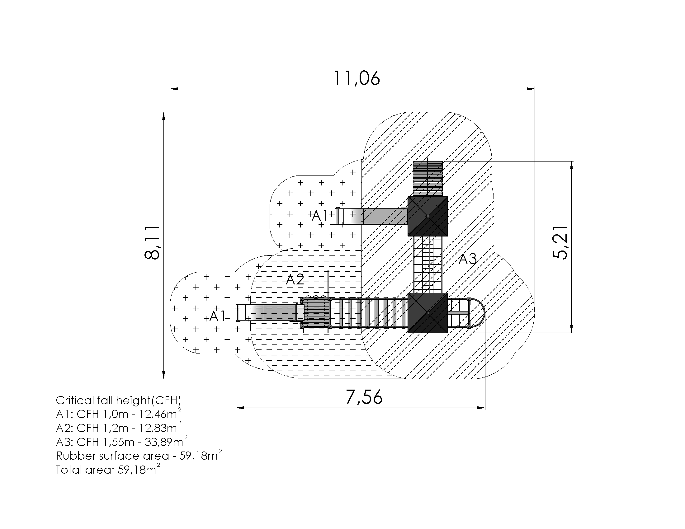 Mängulinnak kolme platvormi, kahe liurenni ja mitmete tasakaaluelementidega. Väike redel viib madalale platvormile, millelt kas lõbusasti liurennist alla sõita või mööda liikuvate astmetega tasakaalusilda minna edasi kõrgemale platvormile. Seal ootab omakorda valik, kas astuda võrksillale ja libistada end linnakust alla mööda tuletõrjetoru või jätkata teekonda käsipuudega võrksillal ja tuhiseda siis platvormilt alla mööda teist liurenni. Kõrgele platvormile pääseb ka otse, mööda ronimiskividega kaarsilda, lisaks on osavuse harjutamiseks kividega ronimissein. Rollimängudeks on linnakul laevakapteni rool, binokkel ja Trips-Traps-Trulli mäng, lisaks vahva mängunurk, kuhu saab valida istepingiga kööginurga või autojuhikabiini elemendid. Linnaku külgpaneele on võimalik vahetada erinevate tegeluspaneelide või temaatiliste prinditud paneelide vastu (loomad, linnud, kalad, puud, marjad jne), mille täpsed kujundused kooskõlastame kliendiga tellimuse käigus.