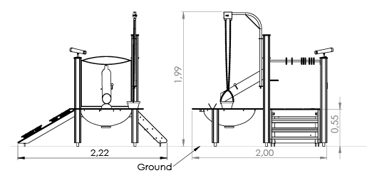 Multifunktsionaalne liivamängu kompleks väikelastele. Platvormil asetsevas mudaköögis saab küpsetada kõige maitsvamaid mudakooke ja pärast need torust alla lasta. Torul on põnev hoob, mida liigutades saab pidurada liiva liikumist. Toru otsas on keerlev liivaveski, mis hakkab liikuma, kui torust liiva alla lasta. Alumine liivakauss on varustatud ka ämbriga, millega saab liiva viia ülemisse kööki. Platvormi turvatoru põnevamaks muutmiseks on sinna lisatud liigutatavad kettad, mida väiksemad saavad nii liigutada kui kasutada ka arvutamiseks. Platvorm on varustatud ägeda teleskoobiga. Platvormile ja sealt maha saab nii mööda väikest treppi kui ka plastikust ronimiskividega kaldteed. Platvormi taga on põnev veoauto mäng, kus saab sõidutada veoautot kahe laohoone vahel.