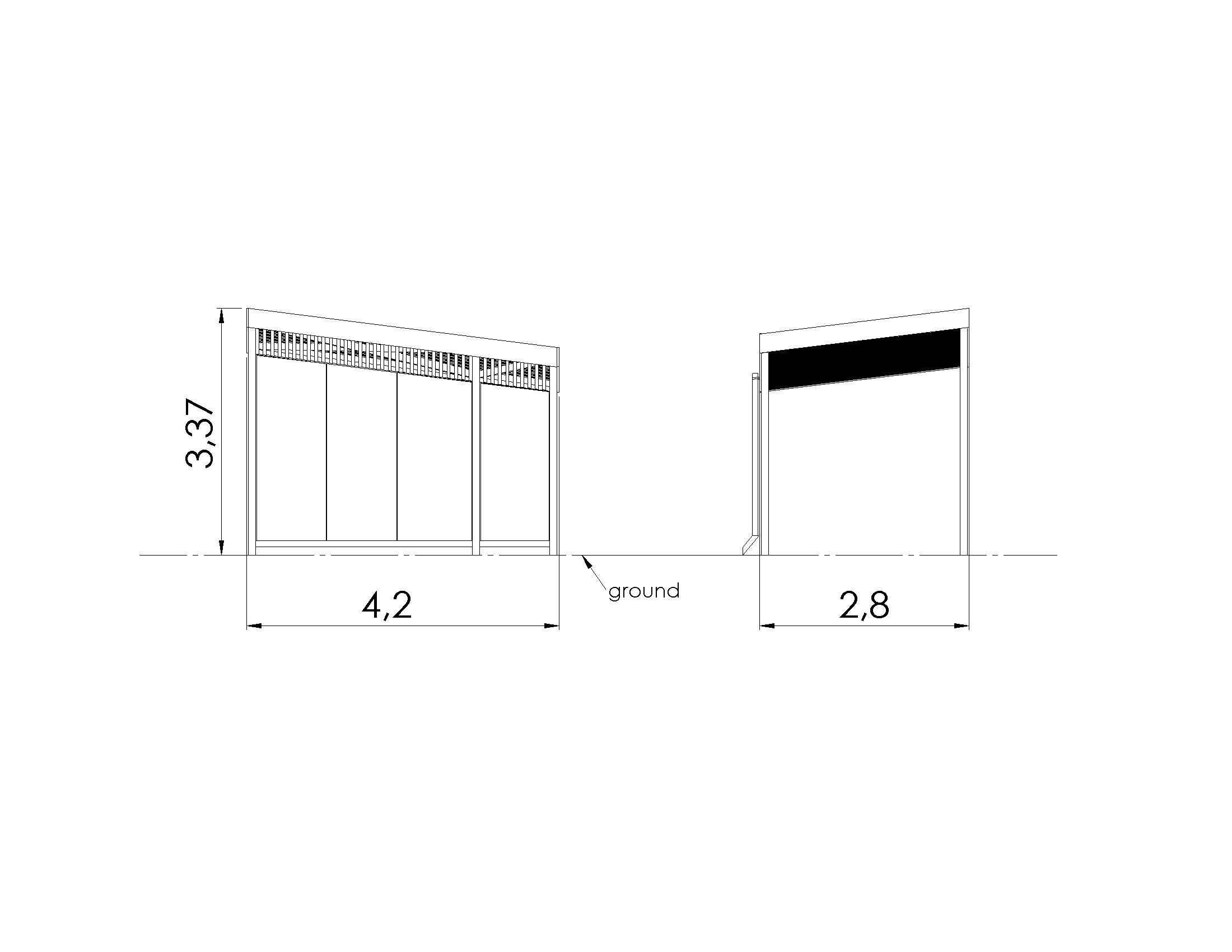 Varjualune on plaani suurusega 2800 x 4200 mm, pakkudes piisavalt ruumi välimööbli jaoks ning kaitset vihma, tuule ja päikese eest. Põhiversioon on avatud kolmest küljest, kuid vajadusel saab lisada täiendavaid seinu. Kinnise seina katteks on kasutatud 8mm paksust karastatud klaasi.